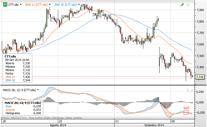Tenho seguido esta acção nas escalas dos 15 min, 1 h e diário, considerando as médias móveis simples de 21 e 50 períodos e o MACD 26;12;9.