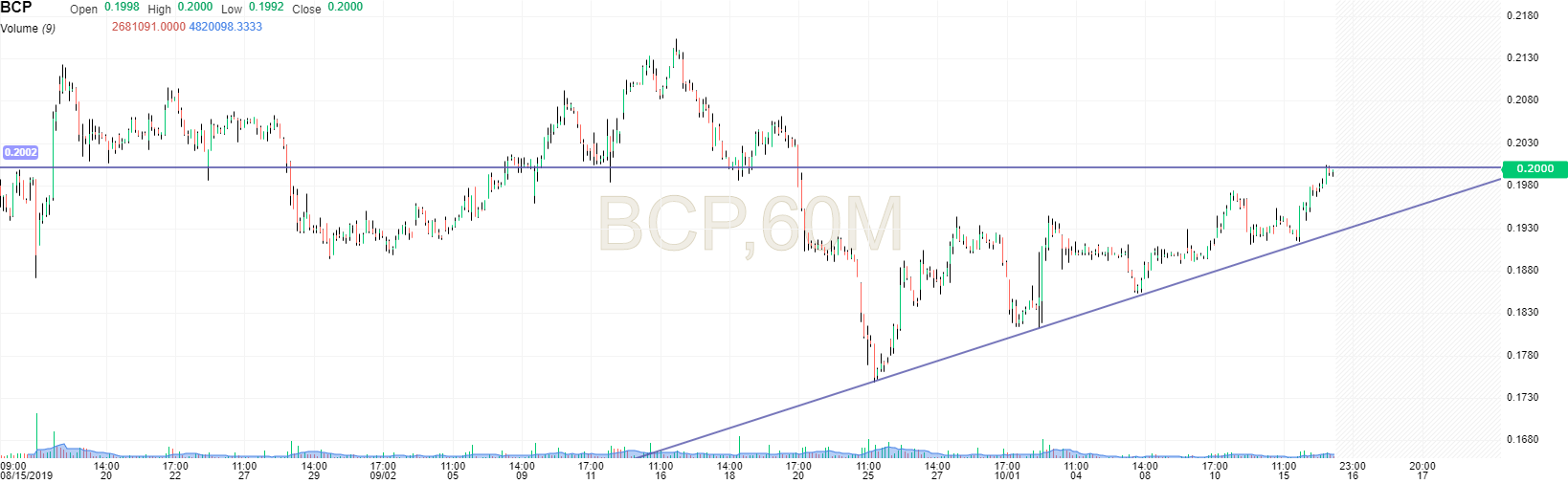 BCP encostado à 1ª resistência 0,197-0,20, vamos ver se tem força para hoje fechar acima dela.