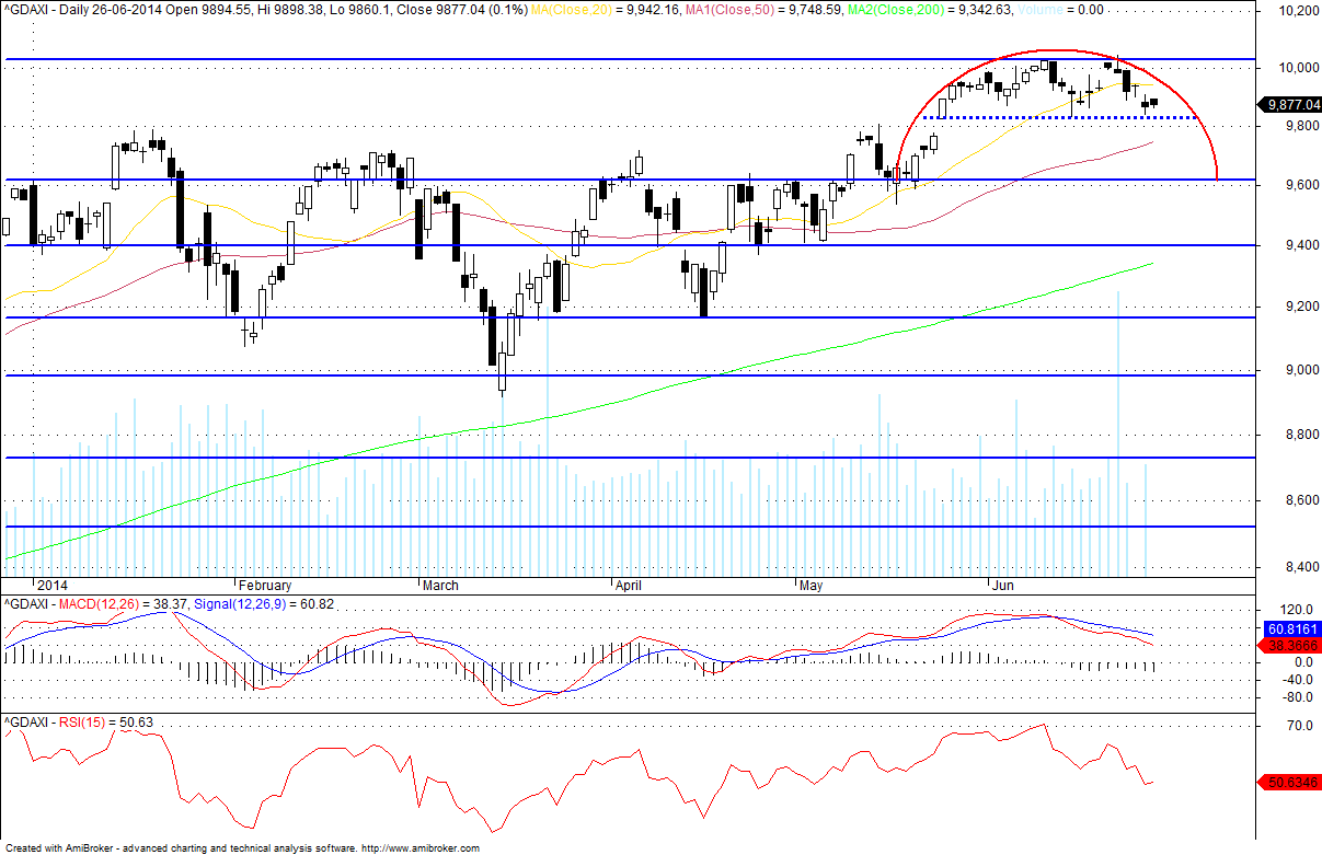 o DAX parece andar de lado....o preço está num range (lateral)...a coisa tanto pode rebentar para cima como para baixo; tanto podemos estar a assistir nestes niveis a consolidação com acumulação ou distrubuição; é esperar para ver!