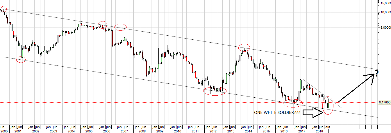No âmbito da actual correção do título, no gráfico podemos ver a confluência de 3 suportes, móveis e fixo à volta de 0,16 (essencial que não quebre em fecho diário), mas sobretudo vemos o fulcro potencial: LTD com 18 meses nos 0,205 que caso superada potencia um inelutável salto até aos 0,48 (tendo apenas uma super resistência fixa, grosso modo nos 0,25, e uma quase irrelevante nos 0,193).