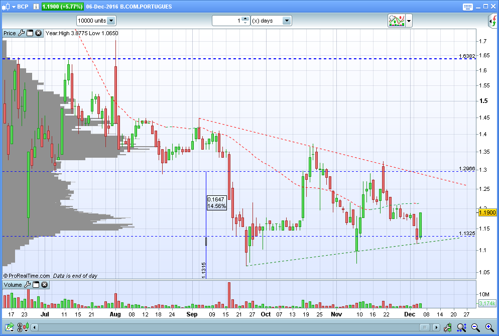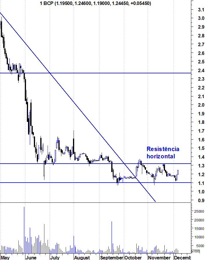 Dois dias de forte ressalto no BCP. Tecnicamente, aquilo que pode marcar a diferença é a ruptura da resistência na zona entre os 1,32 e os 1,35 euros. Enquanto isso não acontecer, as subidas são encaradas como mero ressaltos neste horrível "Bear Market".