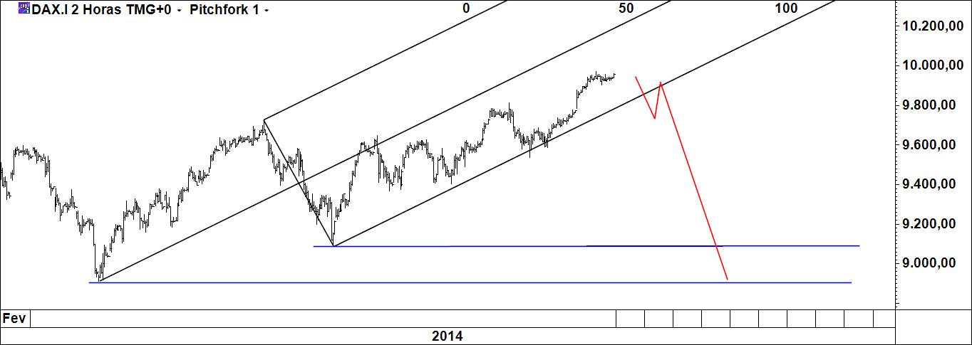Deixo aqui um gráfico do dax a 2 h. Diz a teoria que enquanto o preço se mantiver dentro do fork a tendência é ascendente e com objectivo na linha média. Como estou de fora só terei interesse em shortar se a linha média inferior for quebrada, fazendo o movimento que assinalo a vermelho (não ali mas num qualquer ponto da linha, como é evidente), sendo que para a queda prosseguir não é necessário que depois da quebra haja teste à linha. Mas este movimento seria interessante do ponto de vista da colocação da stoploss. Até tal suceder limito-me a assistir, já que para comprar cheguei tarde. Já agora, refira-se que o dax também gosta de fazer montanhismo.
