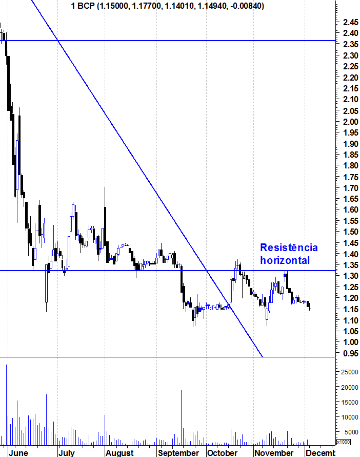 ativo Escreveu:A cotação do BCP tem estado, nas últimas sessões de negociação, sobre um suporte situado entre 1,1475 euro e 1,17 euro. A quebra do nível de 1,1475 euro seria muito mau sinal ...