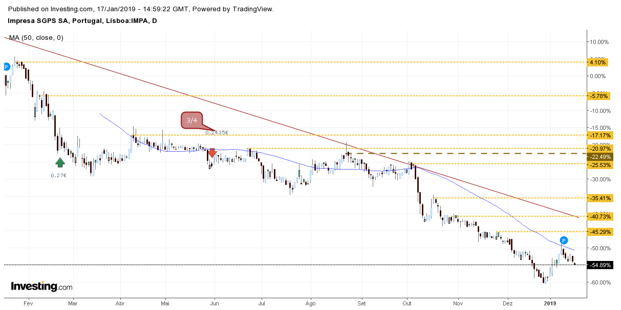 A impresa no efeito subida inicio de ano , conseguiu fazer uma recuperação até á mm50 . a partir dai são mais fortes os vendedores e o titulo cai há 6 dias estando já abaixo da mm50 e mm14 onde tem andado sempre desde agosto de 2018 e sem nenhuma força para subidas . indicadores técnicos ainda longe de nível interessante para entrada especulativa RSI ainda nos 50 . suporte nos 0.13 euros . para já mantem-se em queda e sem sinais de inversão