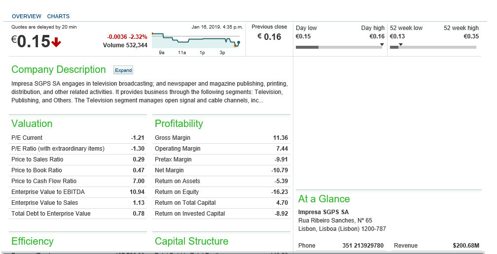 José antónio, clone do eagle, essa conversa já deves ter plantado aqui umas vinte vezes. Nada do que aí referes é impeditivo de uma recuperação forte da impresa. Poderá até fazer um duplo fundo, mas os dados relativos às audiências levam a crer que a Sic poderá levar a Impresa para cima. Para quem acredita e está dentro com uma pequena posição como é o meu caso, a reentrada far-se-á caso se confirme que volta a mínimos. Uma quebra de 0.17 com volume anuncia outros voos.