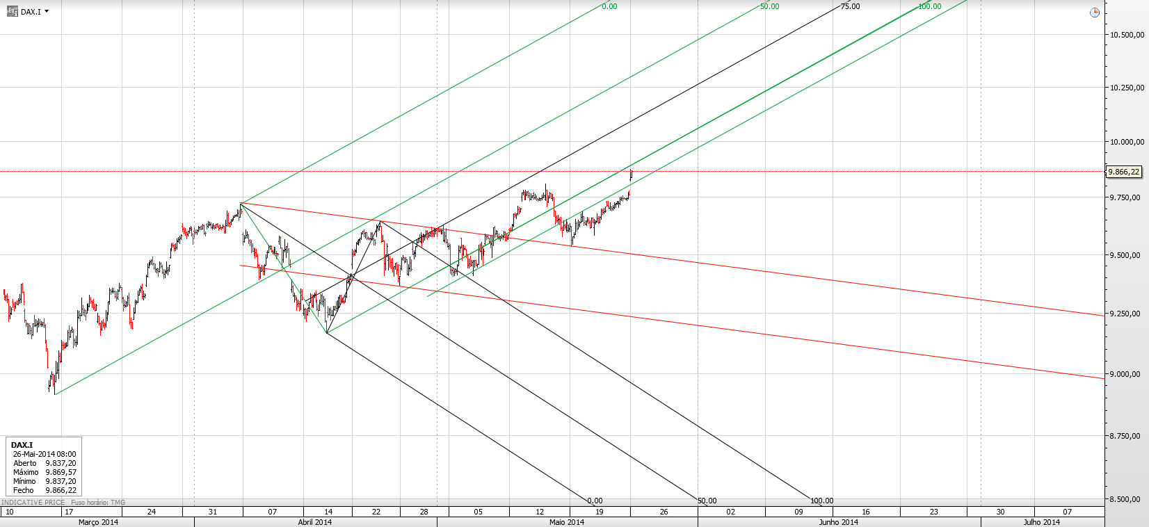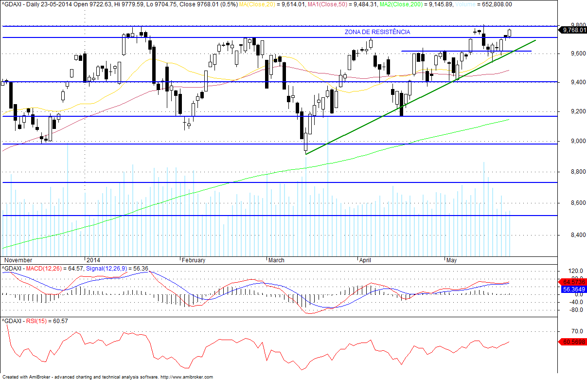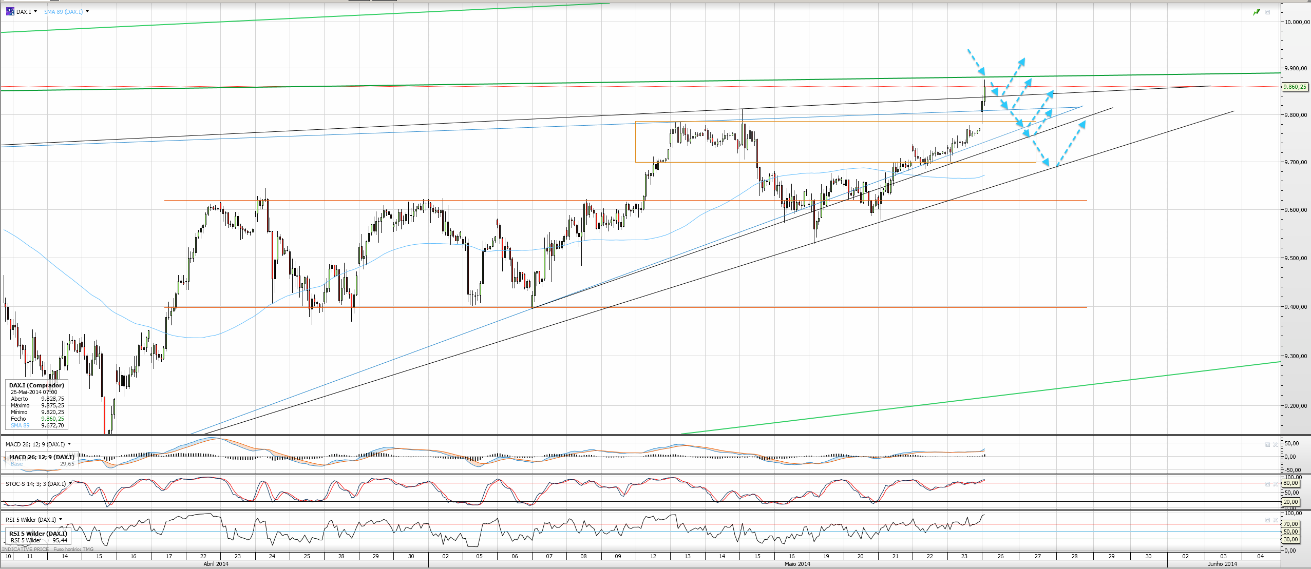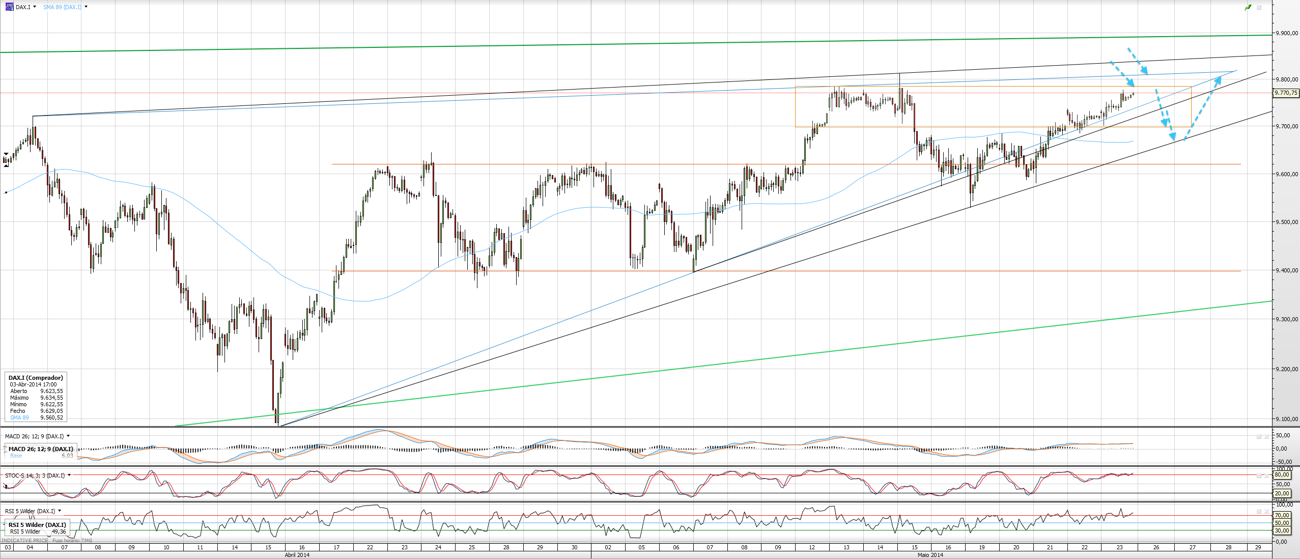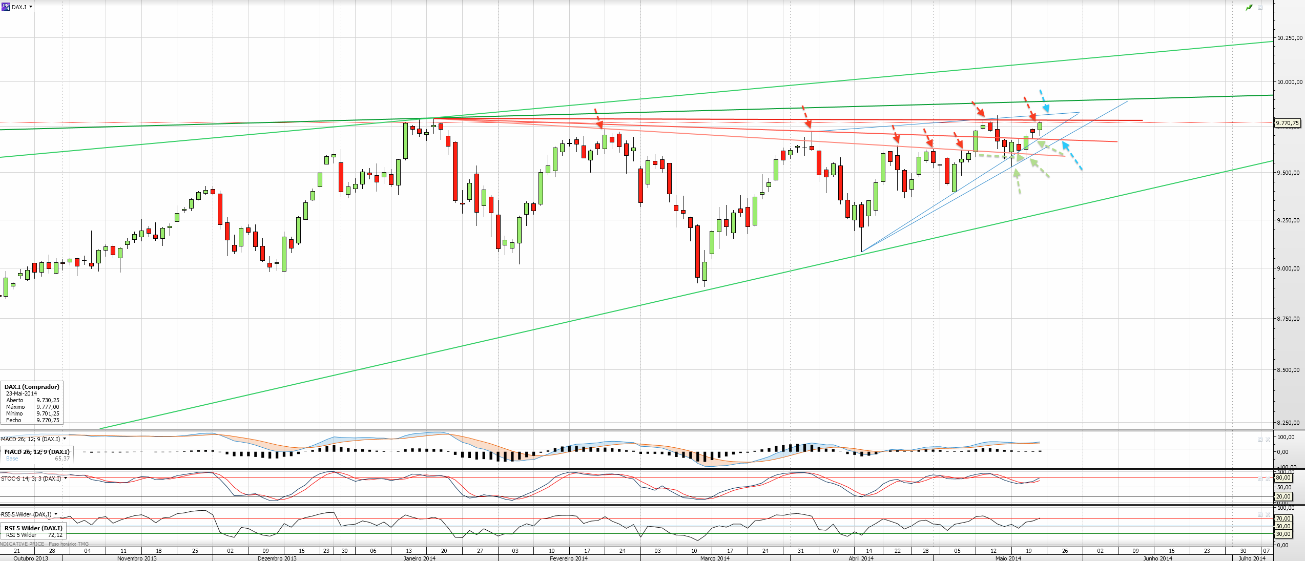 Se o dia de hoje não chegar ao topo do triângulo projectado fico com sentimentos contrários! Acredito que ainda possa subir mais, catapultado sobretudo pelas eleições europeias ou ucranianas (who cares) ou então aliviar, não pelo DAX propriamente dito, mas por associação a movimentos curtos do SP500.