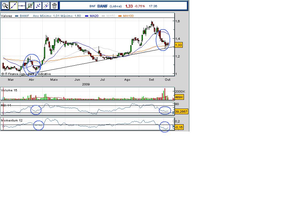 Infelizmente, nada percebo de análise técnica (talvez um dia?). Mas enquanto muitas cotadas subiram mais de 100% desde os mínimos (do período Set 2008 - Março 2009), o Banif apenas subiu cerca de 35%. E Horácio Roque gere bem o Banco. Além disso, o Banif tem indiscutivelmente os chamados "triggers": possível concentração na Banca, quer directa (OPA ou fusão com Finibanco, por ex), quer indirectamente (OPA ao Finibanco, instituição na qual o Banif tem participação de 30%). Por tudo isto, o Banif é uma aposta muito interessante.