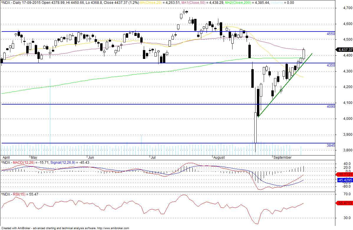 Partilho o meu gráfico do Nasdaq 100. Nota-se que vinha a perder força a subida, sinal disso é a divergência do RSI, que culminou com um spike que não teve força para quebrar a zona dos 4380 - 4400 (onde tinha sido aberto o gap em Agosto). Se se confirmar a quebra da LTA que vinha a suportar o movimento ascendente, então rapidamente deveremos ver o índice ao nível dos 4300.