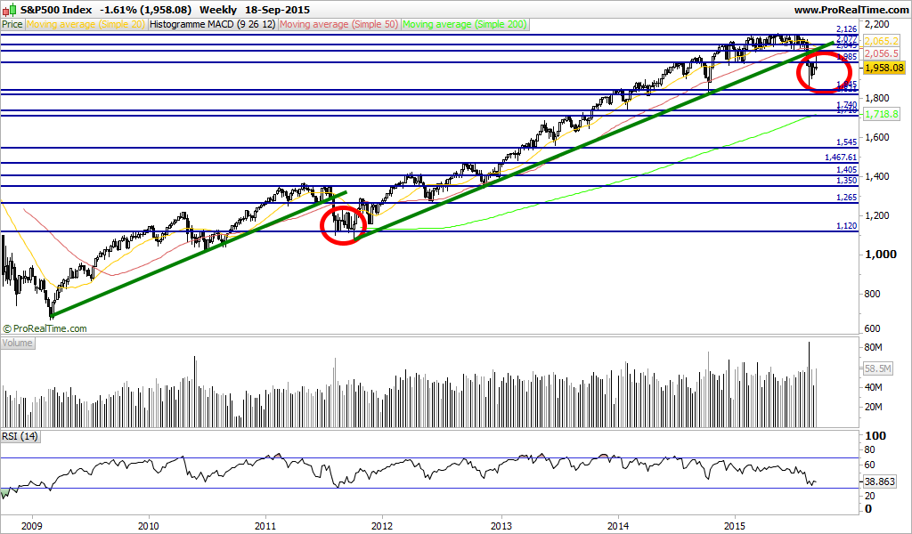The S&P 500 SPX, -1.62% had been riding a strong weekly uptrend, defined by the trendline connecting the bottom of the last correction in October 2011 with the bottom of the November 2012 pullback and the October 2014 low. The S&P 500 fell below that line in late August, meaning the uptrend flipped to a downtrend.