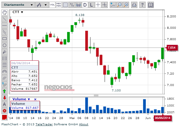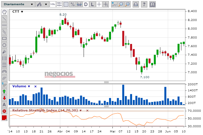 No caso específico é uma mera intuição pois não tenho dados fortes que o apoiem, daí ter escrito «parece». No entanto, e com a excepção da última sexta-feira, a subida dos CTT desde 4.Jun (a que alguém falou na altura de bullish engulfing), está a ser inversamente proporcional ao volume de transacções realizado. A ser assim a subida está a perder força pelo que, a continuar, duvido que chegue sequer perto da resistência dos 8,18€, sem antes «respirar um pouco», sendo imprevisível, para mim, o grau dessa correcção. Repito que para já são meras intuições partilhadas por alguém que percebe muito pouco de AT. No entanto tomara eu que nada disto faça sentido e o rally supere os máximos históricos...