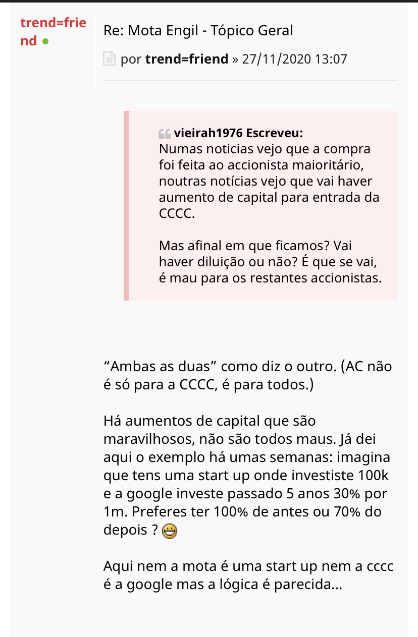 Punitor, cuidado com a espuma. olha para a substância. Quanto passará a ter a Mota em free float? Olha para a carteira de encomendas e para o potencial do acionista novo que pagou 3 euros só para a Mota deixar de ter o controle. Ficarão só pelos 30%? Se fosse para ficarem por aí porque carga de água exigiriam que a Mota perdesse o controle. A espuma é a espuma...