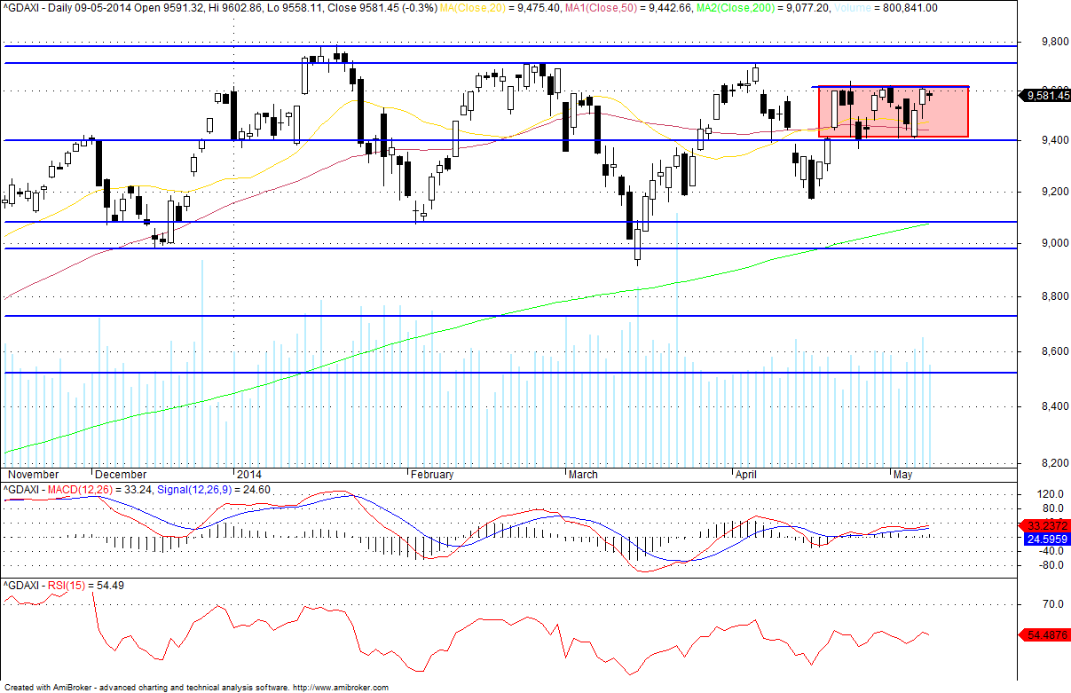 O dax, hoje, quebrou em alta a lateralização de muito curto prazo que vinha fazendo entre os 9410 e os 9625 pontos e tocou, quase milimetricamente, nos 9700 pontos, valor que, como havia dito, constitui uma forte resistência.