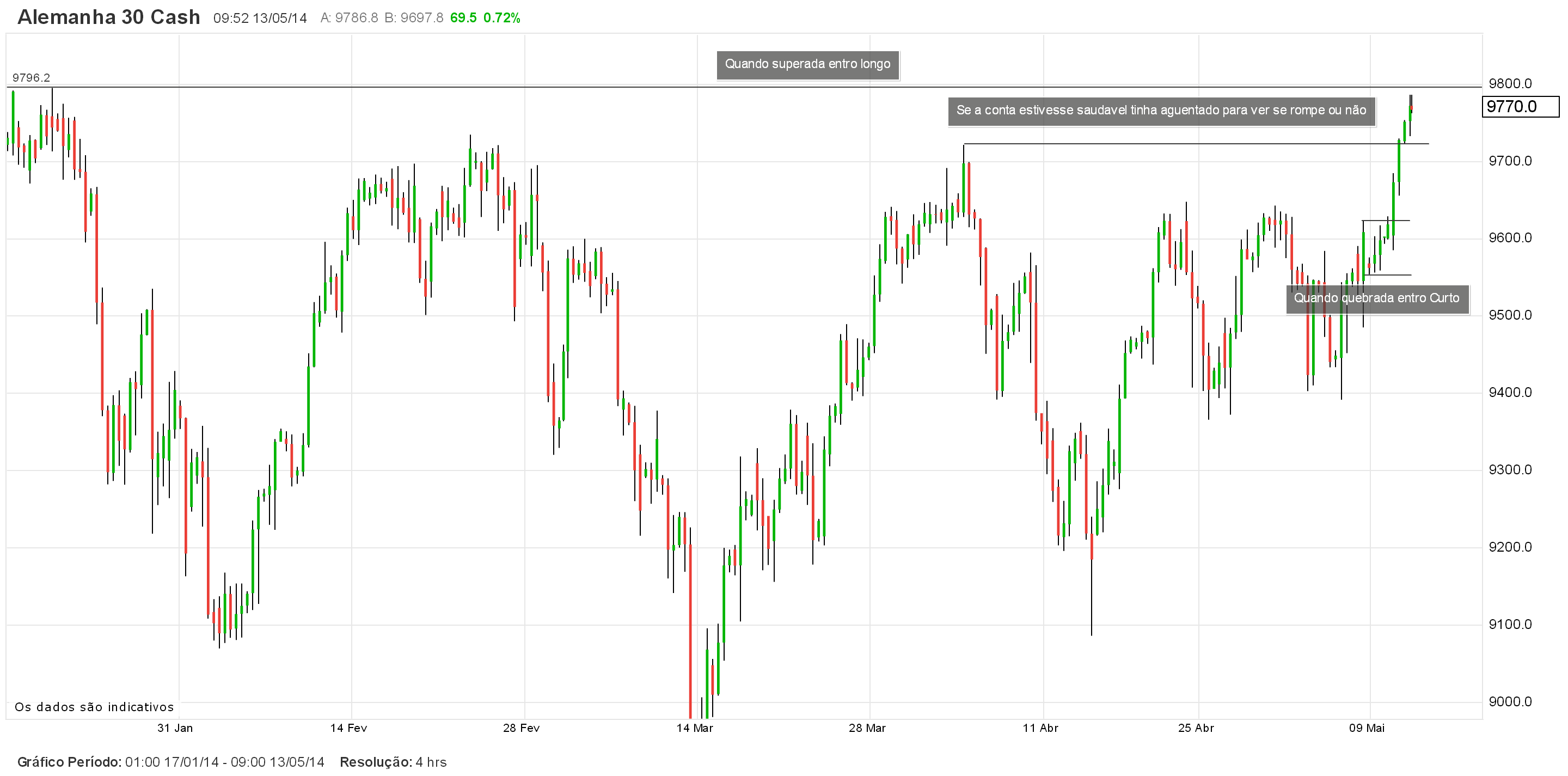 Pois bem, neste time frame, o dax tem estado impróprio para cardíacos, sem qualquer tendência definida, ou seja, em manifesta lateralização, desde o dia 22.4., entre os 9625 e os 9410 pontos (linhas verdes horizontais no gráfico)