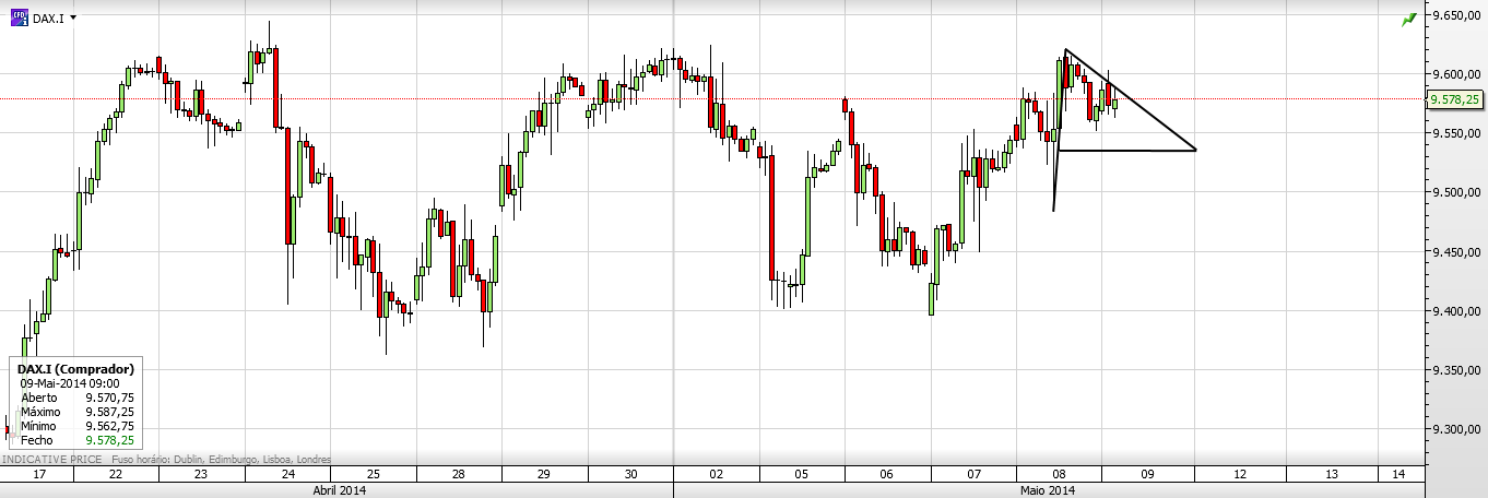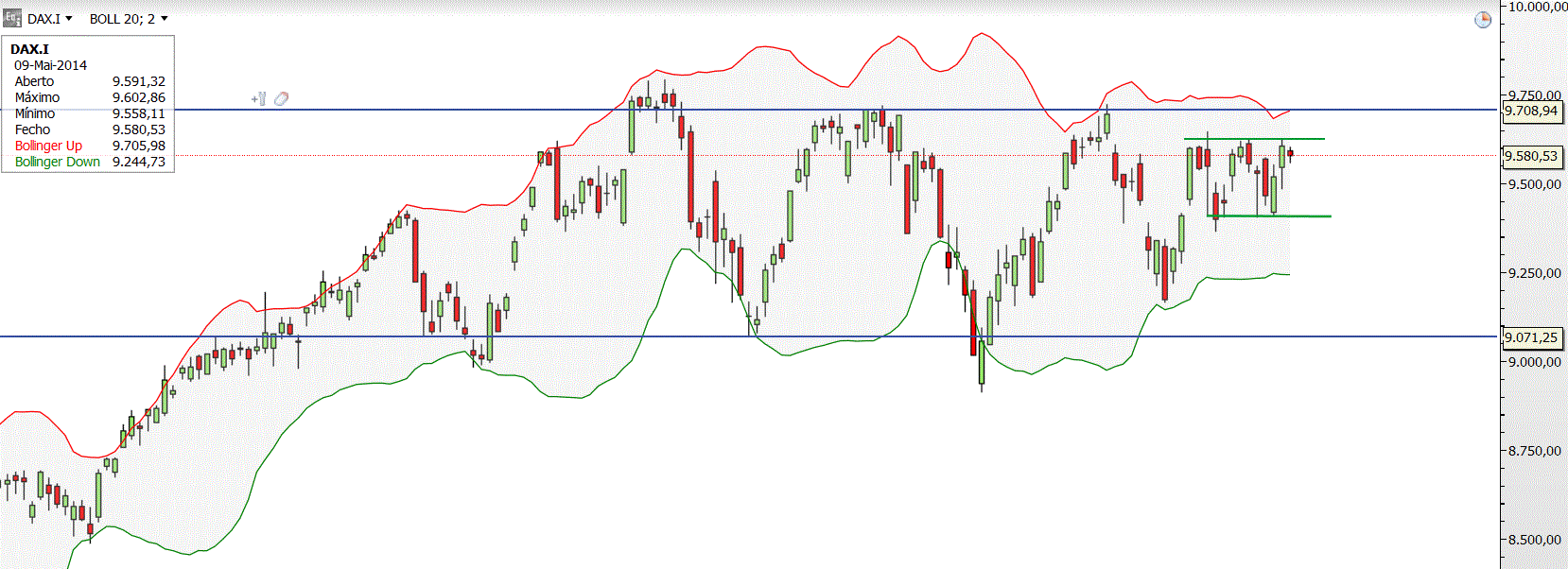 Pois bem, neste time frame, o dax tem estado impróprio para cardíacos, sem qualquer tendência definida, ou seja, em manifesta lateralização, desde o dia 22.4., entre os 9625 e os 9410 pontos (linhas verdes horizontais no gráfico)