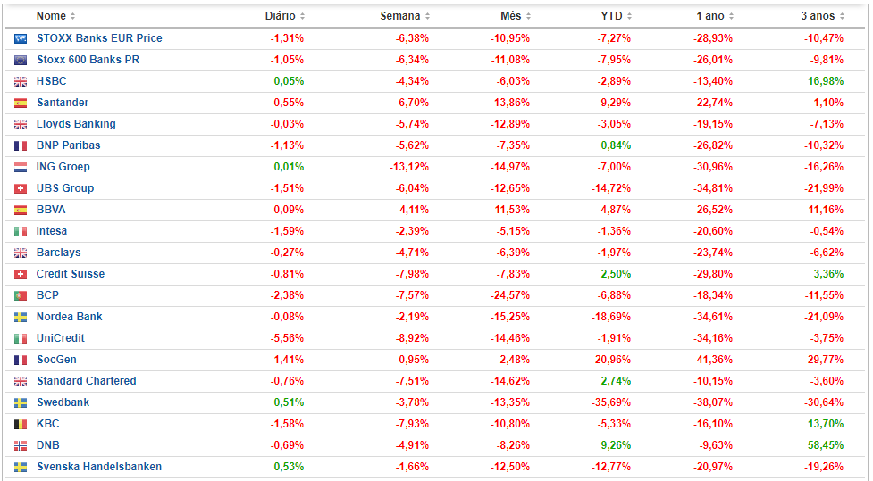 As quedas da banca têm sido volumosas (a politica do BCE não tem ajudado nada). O BCP andou a subir quando os outros já caíam...agora anda a recuperar em força o atraso que leva. A apetência pela banca é pouca e com as taxas assim creio que vai demorar a voltar.