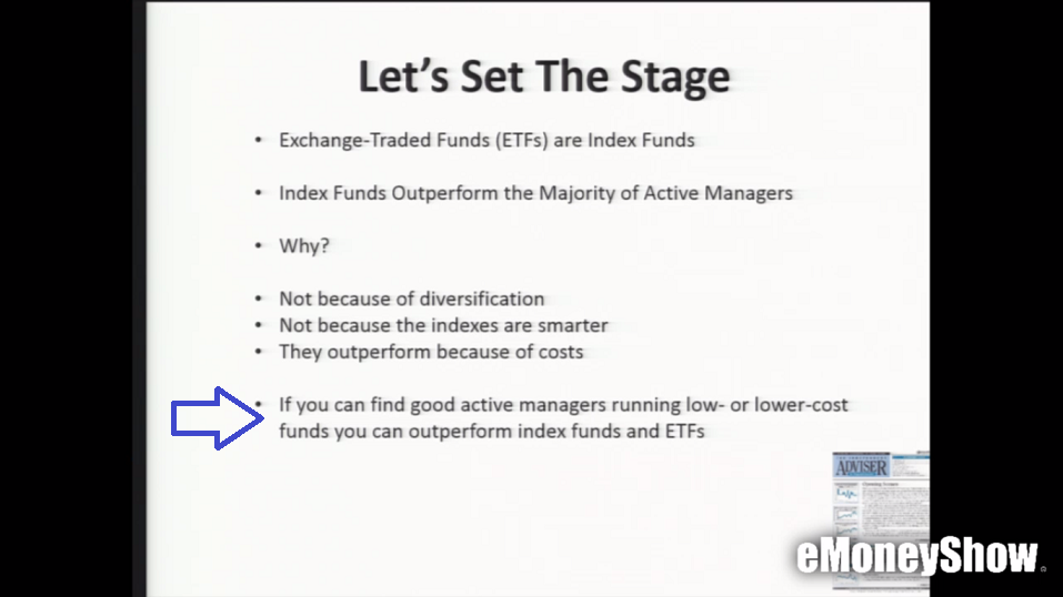 Este é o tema de uma recente conferência, da autoria de Daniel Wiener, sobre um tema tão quentinho: gestão passiva vs. gestão activa e como escolher os melhores de cada grupo. Tal conferência pode ser visionada entrando no site moneyshow.com (o registo é gratuito). Para abrir o apetite deixo uma imagem que ali foi apresentada.
