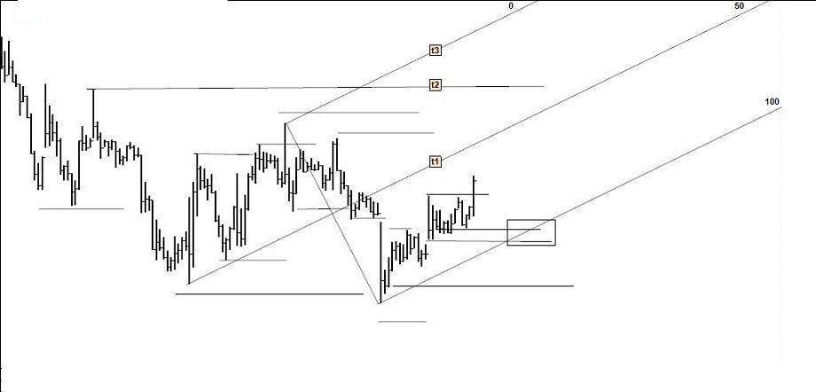Dado que o preço não se dignou penetrar na área seleccionada nem foi à linha, única circunstância que justificaria a compra, já que aqui não se corre atrás do preço, sobe-se a linha de referência e espera-se novo toque que, além do mais, respeite o r:r 1/3. Caso o preço toque na median line sem que a compra seja activada, a oportunidade, tal como foi construída, chega ao fim, e outra se desenhará.