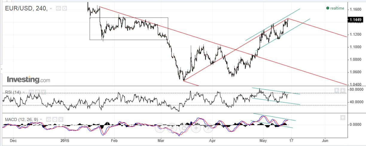 no eur/usd é isto que vejo: preço em zona de conhecida resistência, fork "what if" com um certo ar, indicadores num canal descendente há já uns dias (ainda para mais com o rsi a descer da zona dos 80), razões suficientes para estar de olho num eventual curto.
