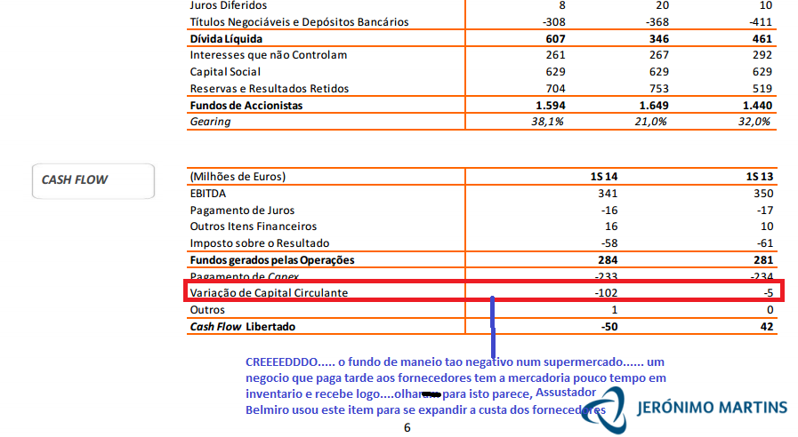Rapidamente as necessidades de working capital ou fundo de maneio de uma empresa è o pmrecebimentos- pm inventario-pmpagamento a fornecedores, se uma empresa recebe rapido e paga tarde como numa cadeia de supermercados em condições normais..... então vai na generalidade das vezes libertar fundo de maneio que vai usar na sua expansão( é este tipo de coisas que o per não diz) .... ora na jm ontem antes de fechar o tasco fiquei simplesmente muito alarmado por isto que vou postar