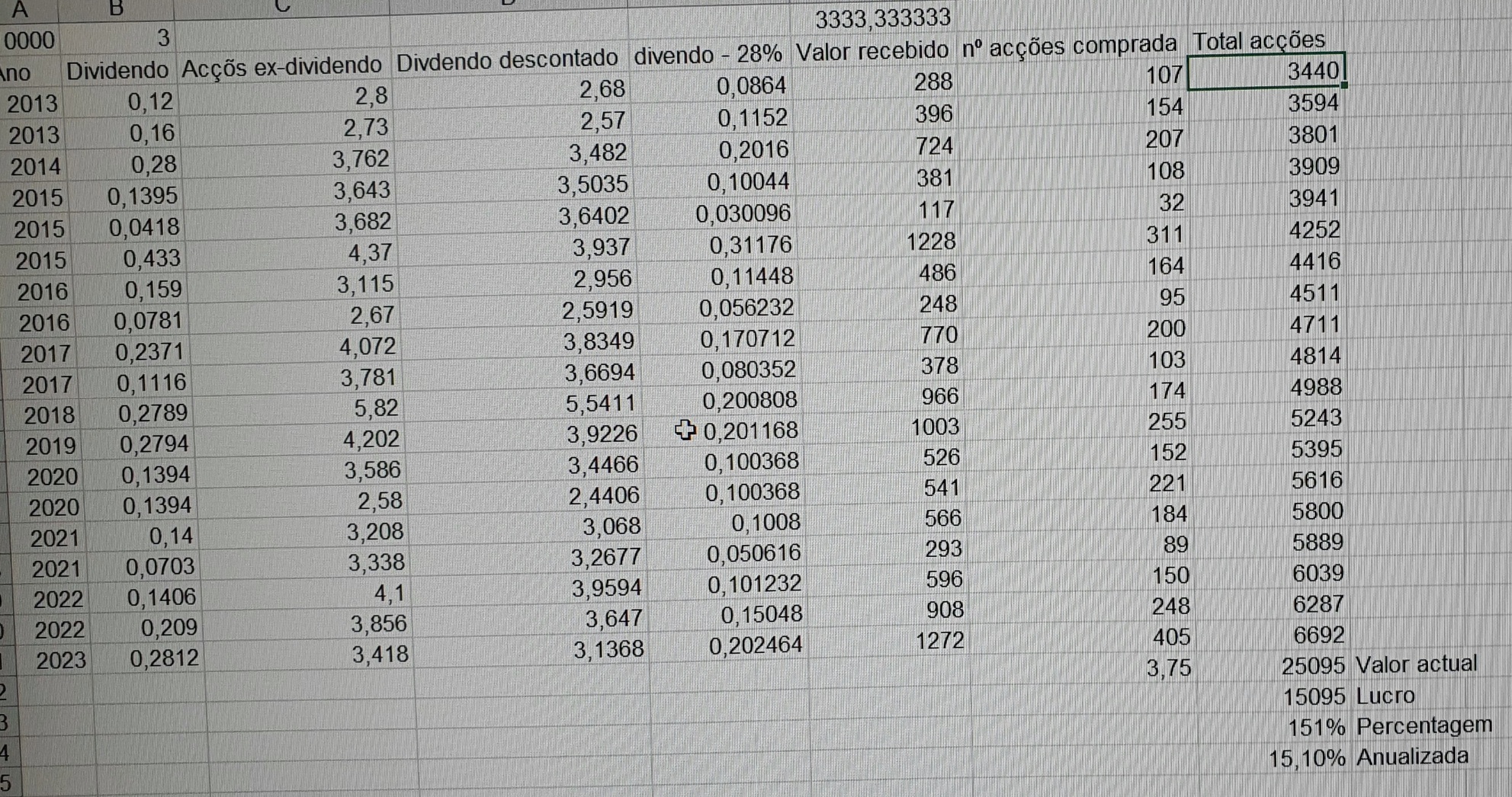 Qual a parte das 3333 accoes ja detidas juntado as 107 compradas com os dividendos que dá 3440 que não percebeste?