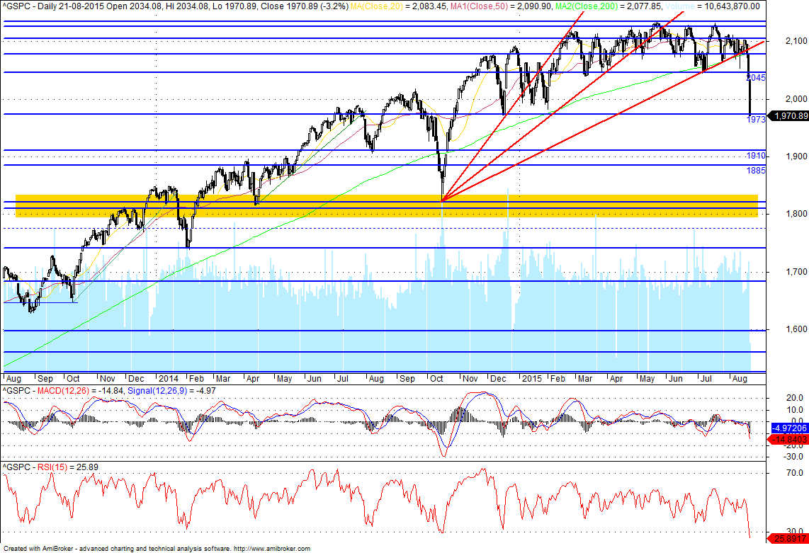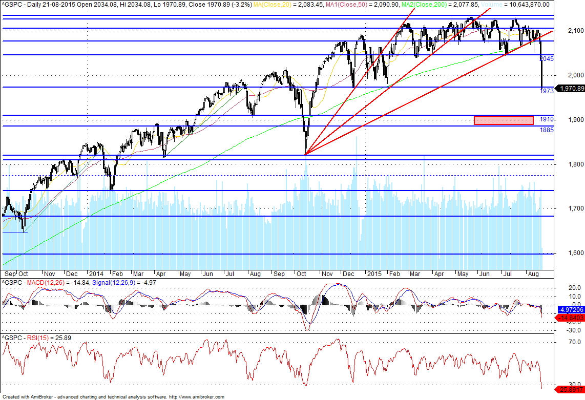 The markets took those minutes as dovish and immediately began pricing out a rate hike for September, even though the Fed indicated it was still undecided at its July meeting. The sell off in stocks worsened Thursday and Friday, with the S&P 500 falling through its 200-day moving average and breaking multiple support levels. Traders say the next downside target is now around 1950.