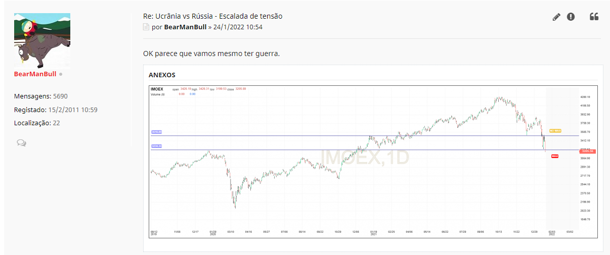 Marco Martins Escreveu:Por exemplo o MOEX esteve bem até dia 24/2 a´te as tropas russas entrarem na Ucrânia. Apesar de tudo indicar que iria haver um conflicto, o mercado ignorou isso até ter uma realidade.