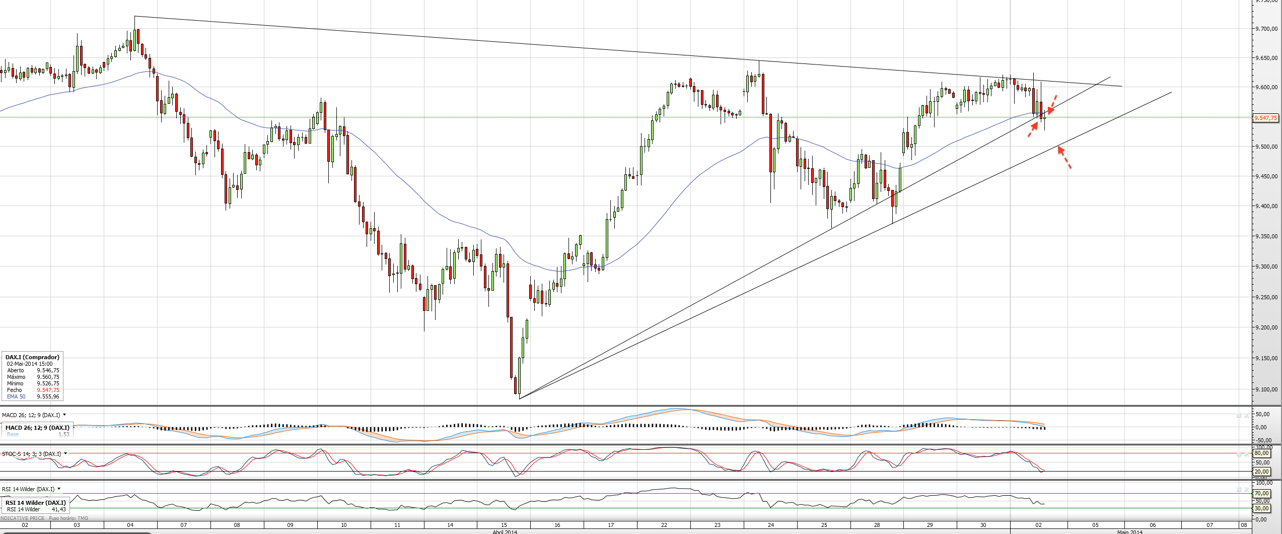 Amanhã acredito que o DAX irá fazer um teste ao abrir aos 9570 e/ou 9584. Mas o caminho parece-me ser descendente após a vela vermlha no diário a indicar que a resistência Ltd é forte (5º toque), de qualquer forma ainda tem espaço para descer e continuar a fazer um higher low desde que não venha abaixo dos 9350/63.