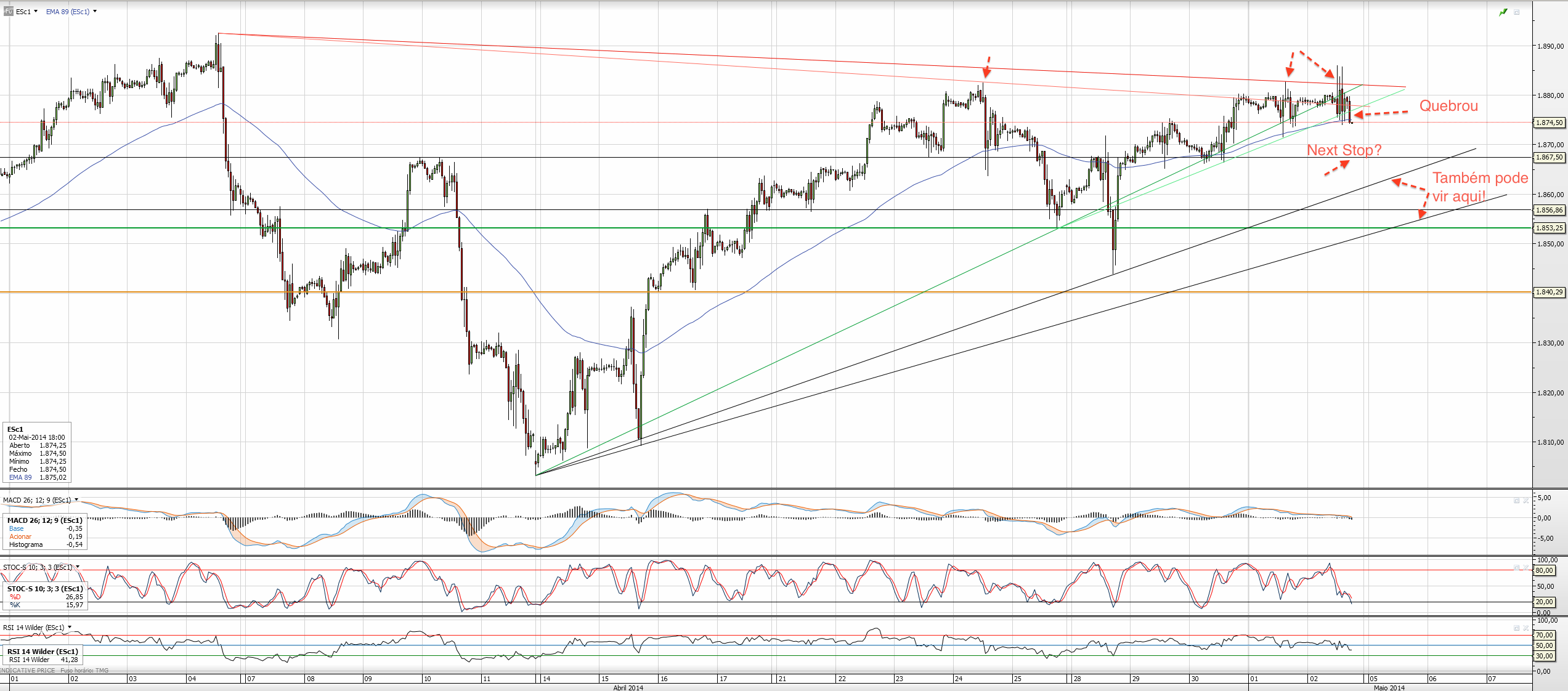 Se os futuros ES às 19h fecharem abaixo dos 1876.75/1877, acredito que o caminho seja descendente até fechar a sessão.
