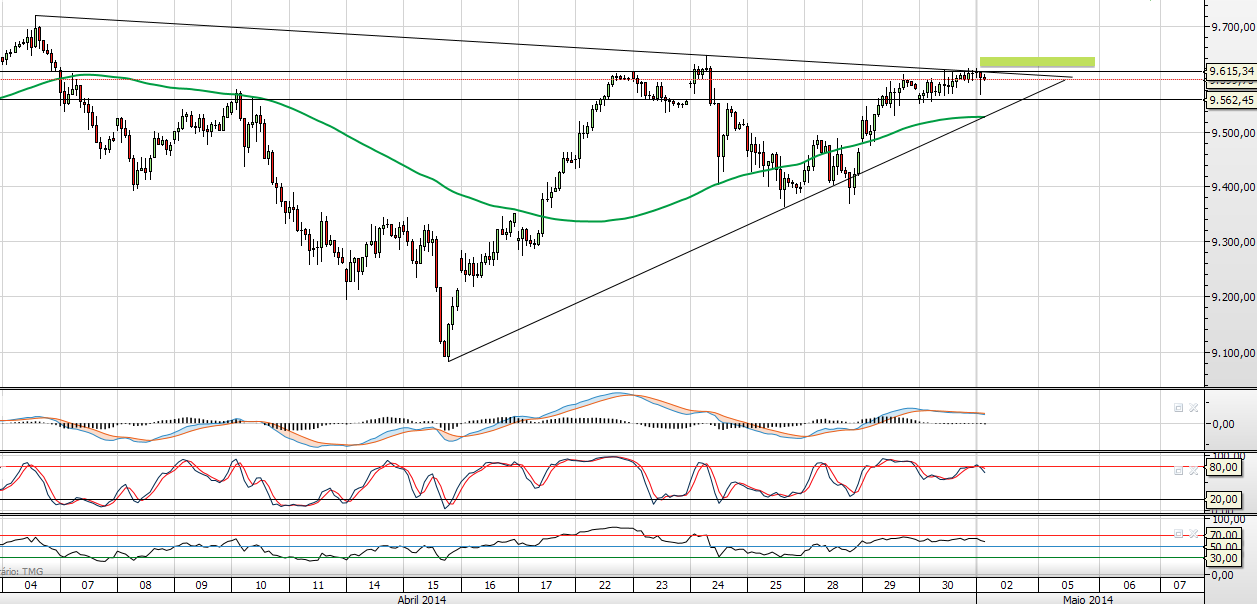 Julgo que a resistência do dia está nos 9610 e o suporte nos 9570, estes são os valores a ter em atenção nos próximos minutos/horas até serem atingidos