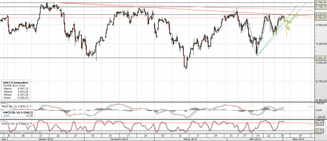 Acredito que o DAX está a ficar fragilizado devido aos movimentos da Ucrânia/Rússia estarem a aquecer para o fim de semana, pois acredito que a AT dá neste momento para os dois lados. Li algures que hoje iria existir uma reunião entre a Merkel e o Obama. Resoluções "positivas" nestas reuniões tende a dar impulso positivo nos mercados. Mas como o Putin não está na reunião, é possível que andem aos tiros no fim de semana para vingar uns helicópteros e ocupação territorial.