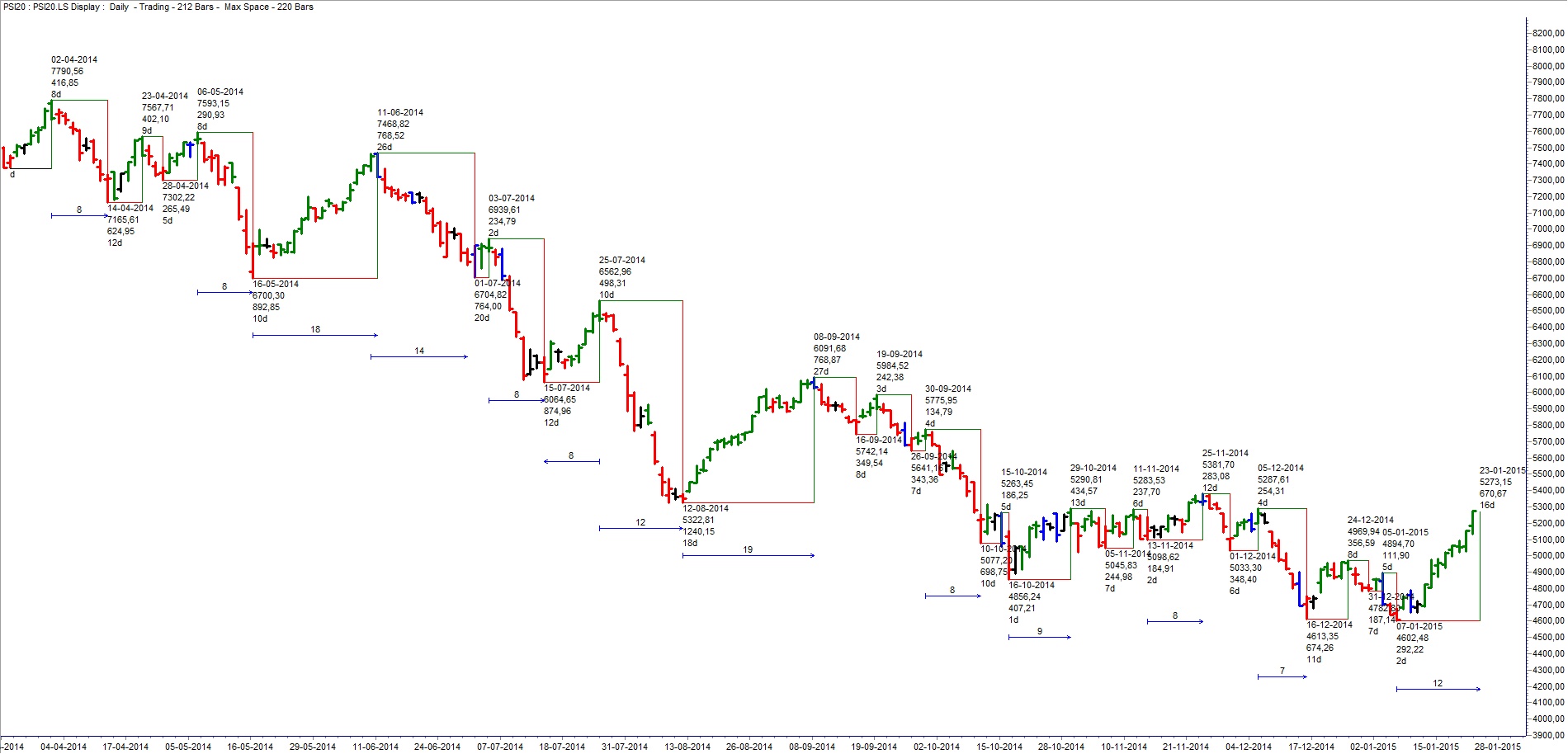 Desde o máximo do ano passado, apenas 3 swings (2 days) ultrapassaram os 12 trading days. A maioria ronda os 8 trading days.
