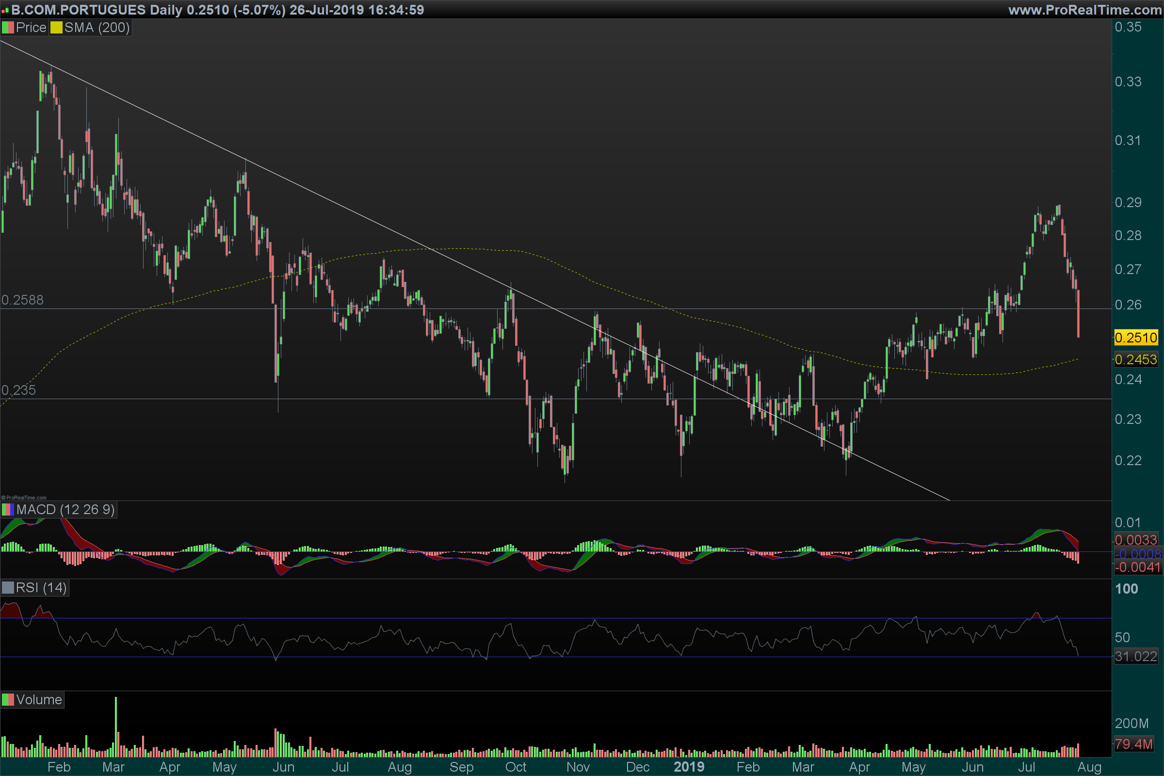 O titulo iniciou o ano nos 0.2295 e com resultados do 1º TRI subiu até 0.29 e agora com realinhamento da expectativa de crescimento dos resultados face aos resultados do 1º Semestre , voltou para já aos 0.25, tendo um forte suporte técnico na zona dos 0.22 – 0.23 onde poderá constituir uma entrada interessante de medio prazo até final deste ano . Face aos resultados , este suporte , poderá ser testado antes do final deste ano , em especial no período outubro – novembro, habitualmente período de teste aos suportes nos mercados .