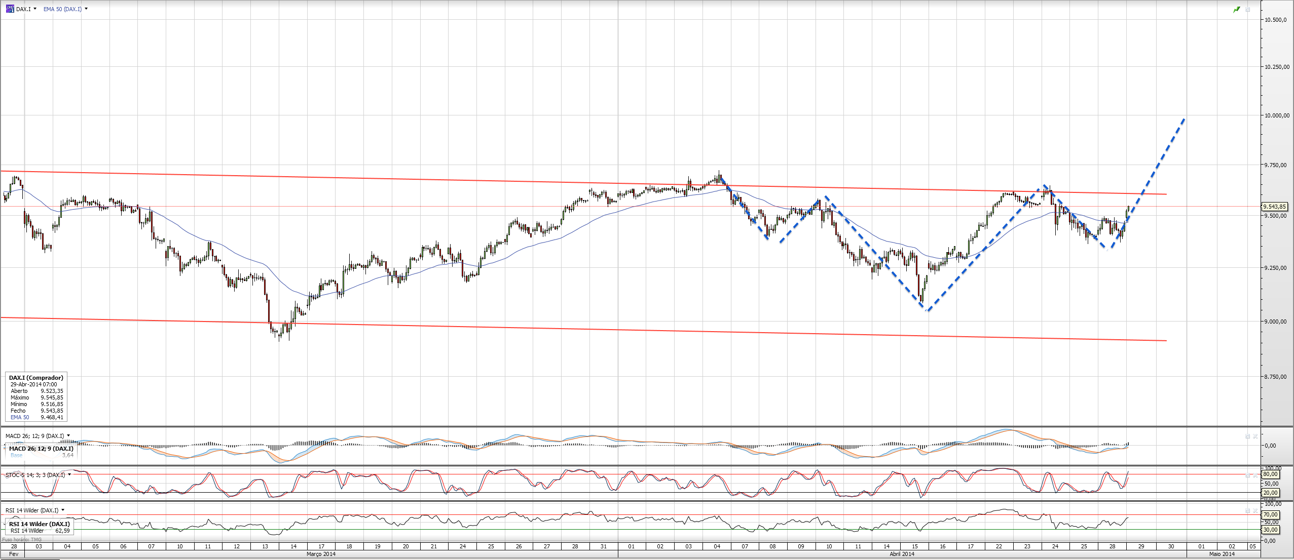 Acredito que o dia de hoje tenha como target os 9600 (topo do canal ou wedge, o que quiserem). Ainda podia aproveitar 60pts com base no plano, mas quero um swing low para entrar grrrr.