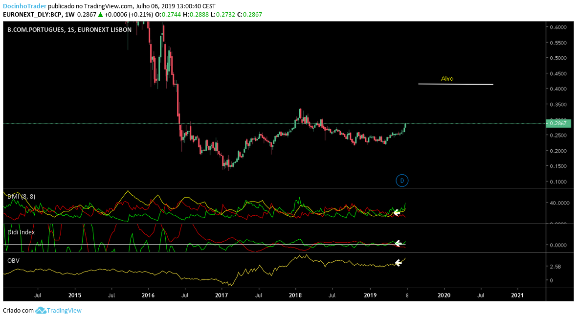 Se olharmos o semanal este,está a arrancar agora na compra e cheio de força,com agulhada nos indicadores e tudo comprado.Seria importante um reteste á zona dos 0.27cts para seguir o rumo com folgo.Em Gann continuamos com os 0.42cts numa primeira fase,depois é ver o que sucede