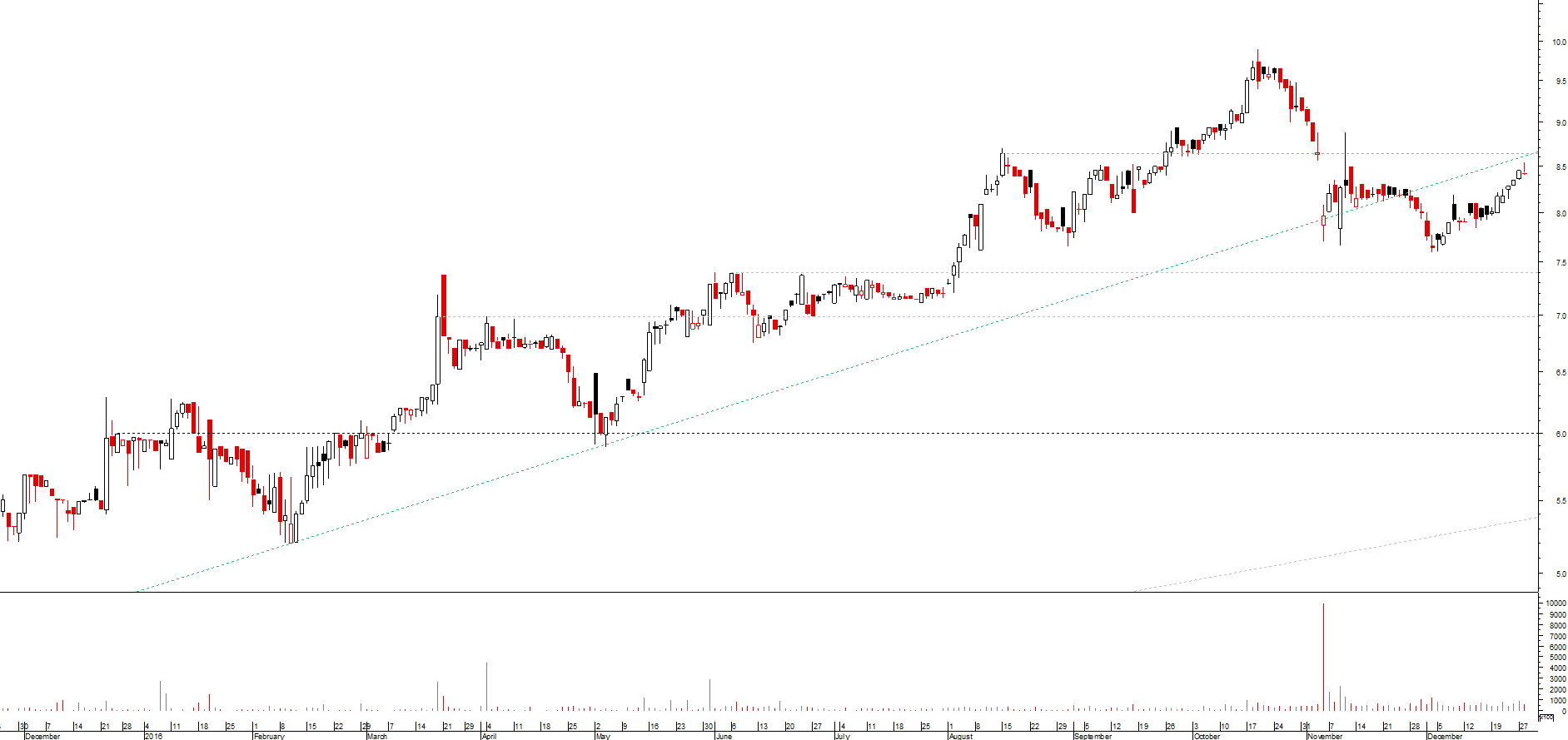 Graças a Deus que apostei, e apostei bem, neste papel. Abri posição a 18Fev 2016, no dia anterior à apresentação de resultados, quando esta ainda pertencia ao PSIgeral. Não sei porque não fechei posição em Novembro quando tocou nos 9.5+.. Talvez por ganância, confesso