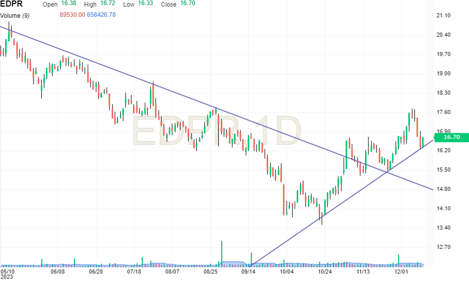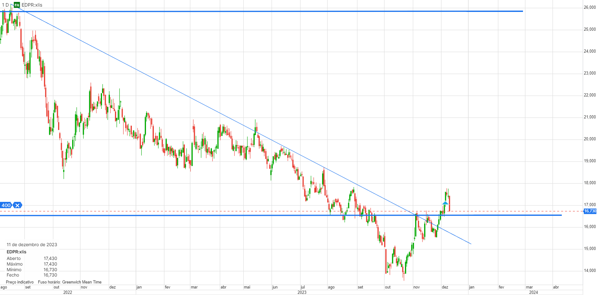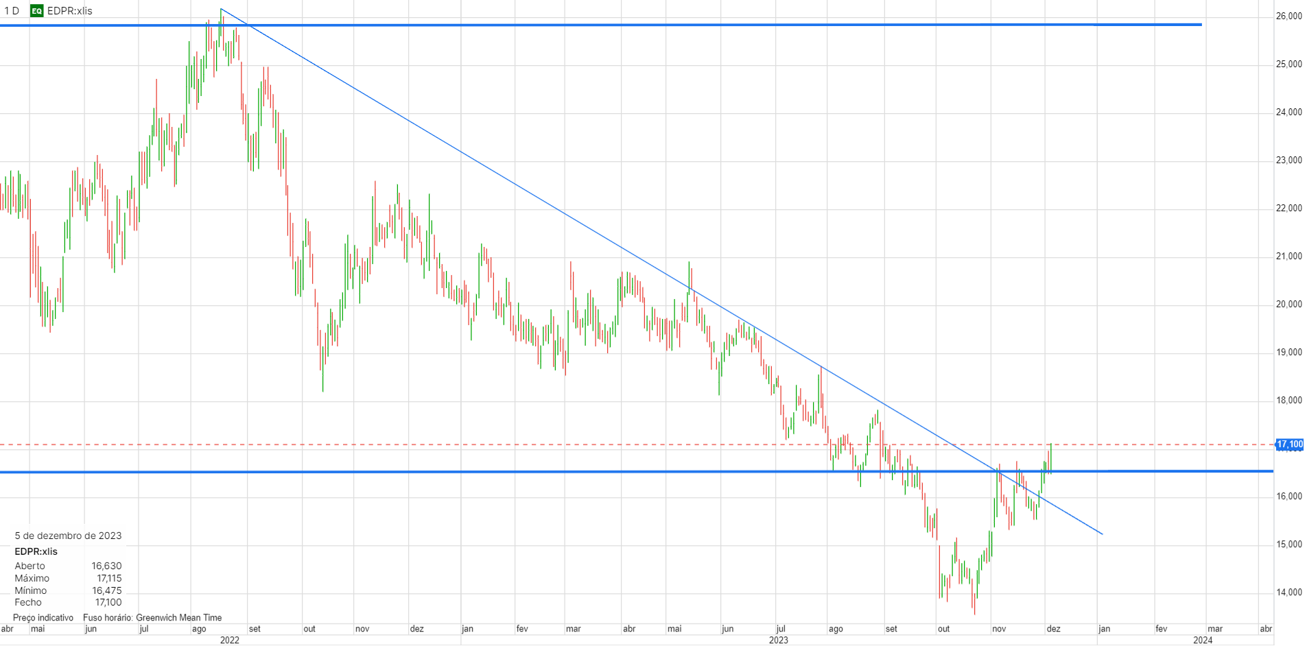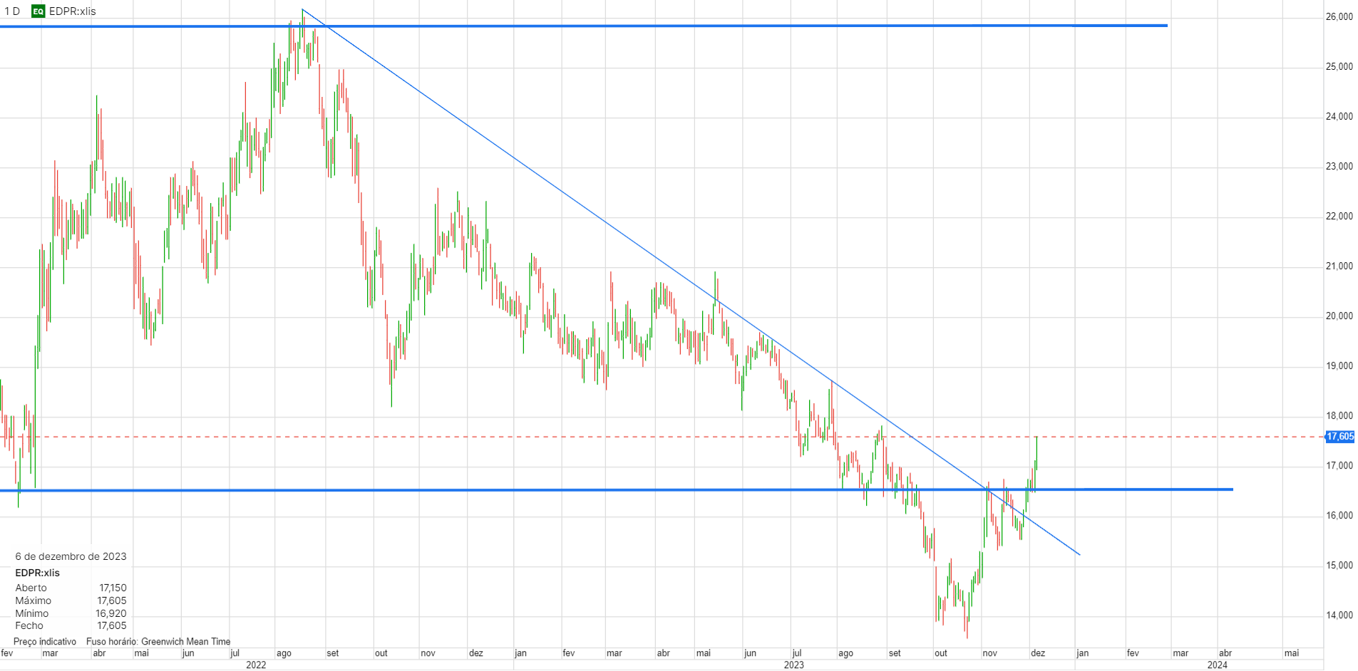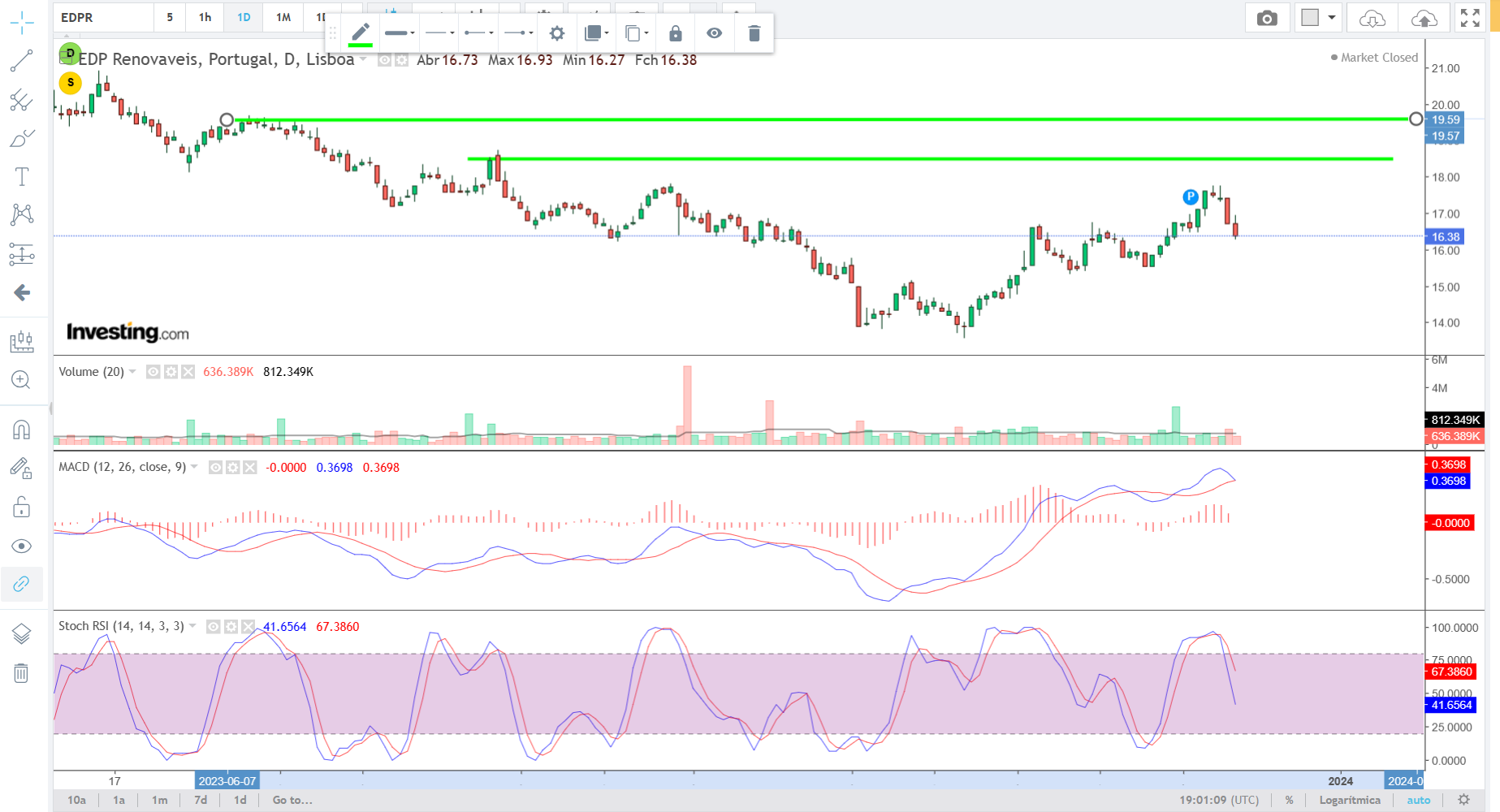 Recuperou o suporte nos 16,5€ e ainda mais importante, quebrou a Linha de Tendência descendente que vinha a limitar o preço. Para mim, esta ultima, é o sinal mais poderoso de inversão de tendência. Amanhã compro uma posição.