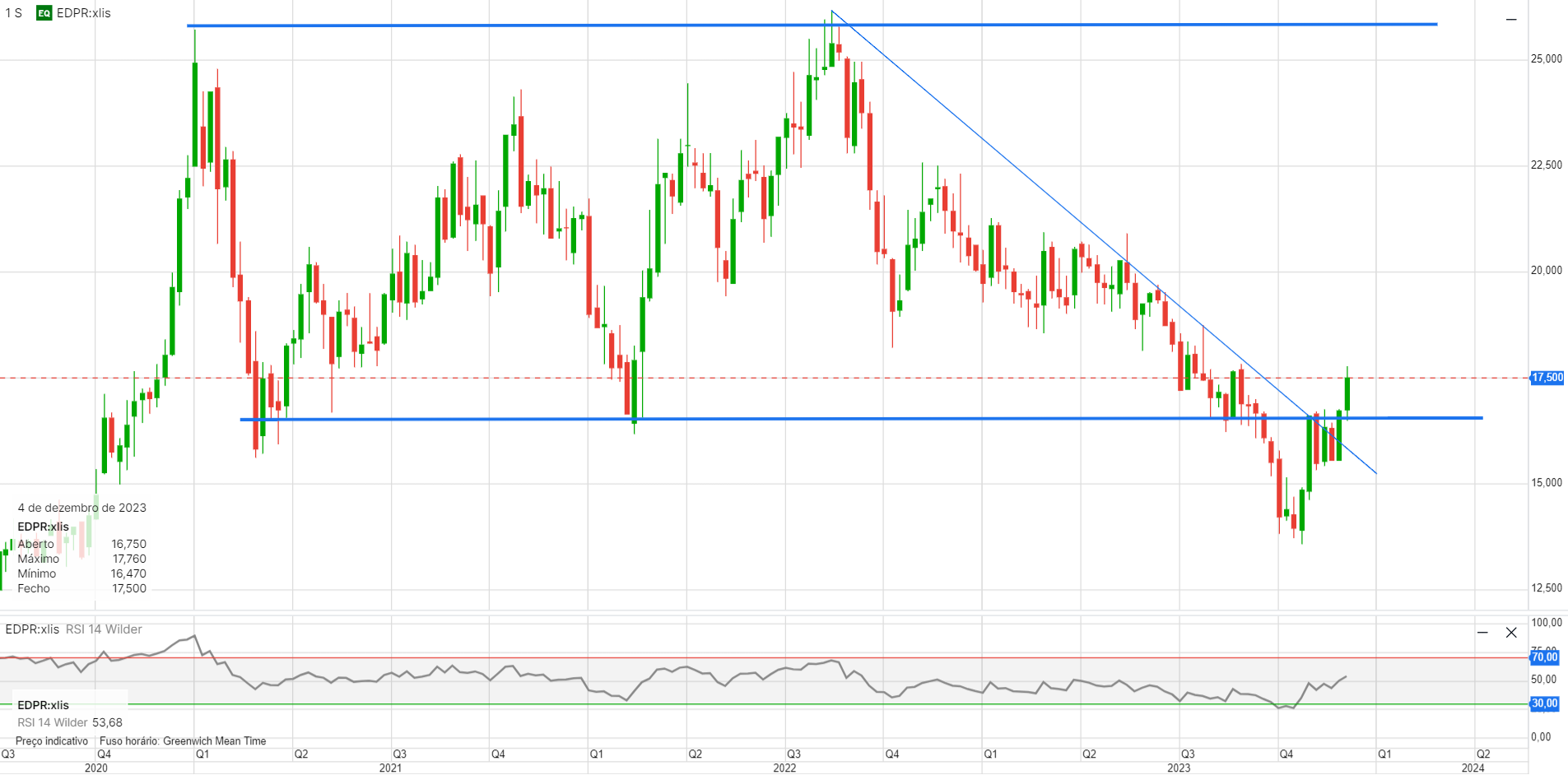 No semanal, ainda há algum espaço para subidas antes de ficar sobrecomprada. Eu apostaria nos próximos tempos numa ida para a zona dos 19€, onde andou bastante tempo.