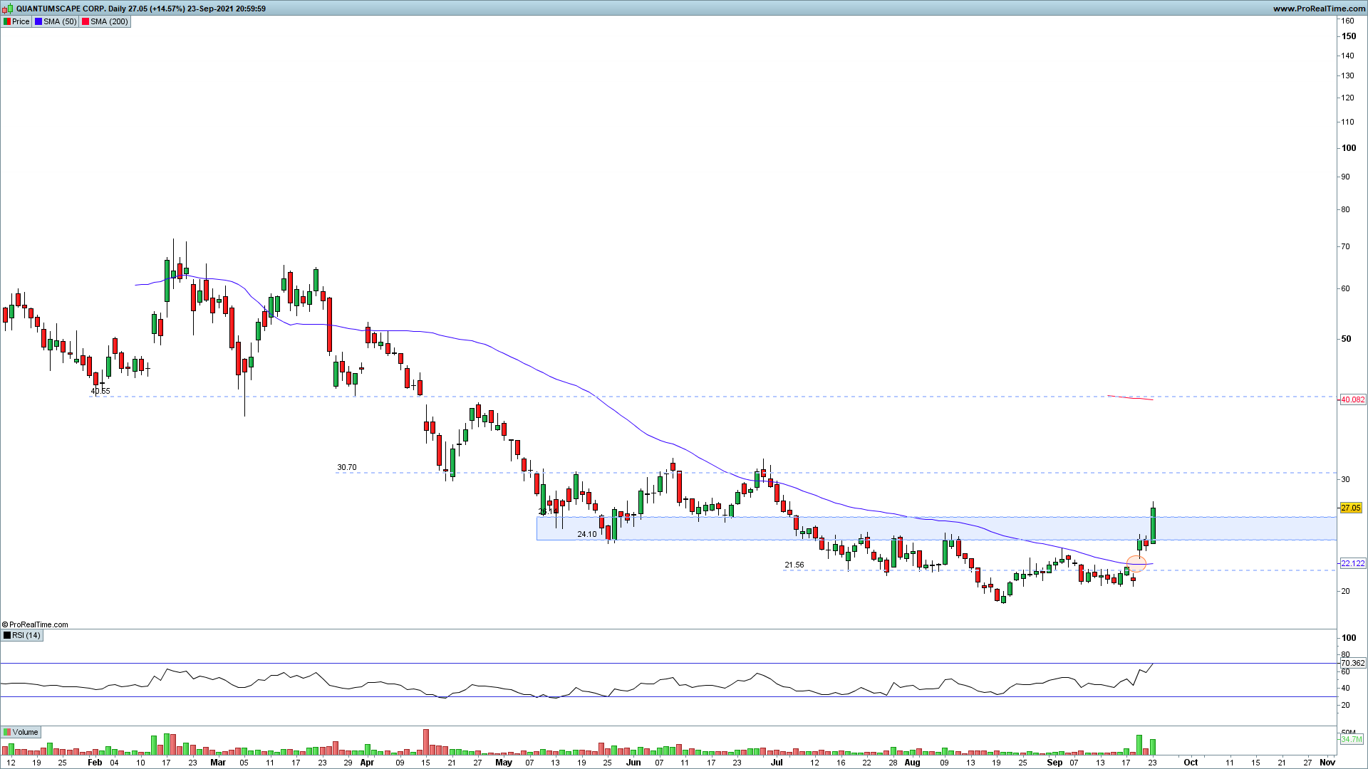 Deixo gráfico atualizado da QS, com uma bela vela a romper a resistência. Seria importante manter-se acima e quem sabe até fazer já um primeiro teste aos 30$, onde muito provavelmente teria de recuar para aliviar indicadores e consolidar zonas superadas.