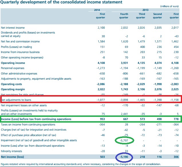 que tinha ser limpo aquisições pelas quais se pagou demais gerando diferenças entre valor contabilistico do ativo adquirido e valor pago, chamadas goodwill que neste caso foi abatido a serio quase 6000m euros de perda só por este fator... tendo o banco adicionalmente optado por limpar o seu balanço aumentando o provisionamento sobre o total dos duvidosos em 330 pontos base num ano isto num cenário em que a entrada de credito queimado se manateve nos mesmos montantes.... ora ele subiu e teve um prejuizo gigante.... por uma simples razao o banco mais nao tinha feito que limpar esqueletos do passado......