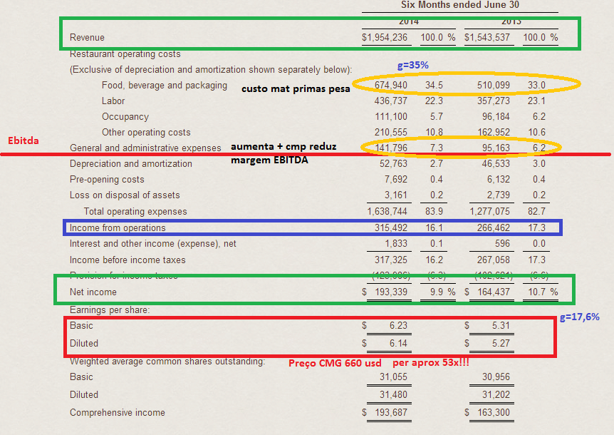 ora cá está crescimento das vendas de 35% e do resultado liquido de 17%... as vendas em restaurantes comparaveis crescerem 17% acho que é um ritmo insustentavel seja por via do consumo medio ou da afluencia das pessoas, um restaurante nao fica a crescer 17% para sempre... é isso que me leva a achar que esta acção para já estará em termos de valor perto do topo...mesmo incluindo uma ambiciosa expansao local e internacional... O ebitda piorou em termos de margem... o custo das materias primas das refeições subiu... é assim um per forward perto de 50 a meu ver já incorpora todo este crescimento..mas estas empresas a meu ver são as mais complicadas de analisar poderiamos usar uma forumla que ja meti na corticeira e vou meter a seguir... e da qual disse eu nao uso isto à letra e este caso mostra bem o porque... das limitações das formulas... o meu bom senso diz-me que algum dia este crescimento vai abrandar mas é incrivel a performance desta empresa na bolsa nao sendo uma tecnologica...