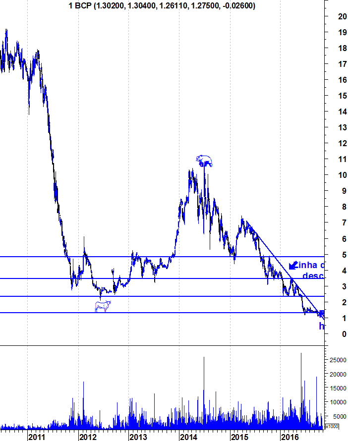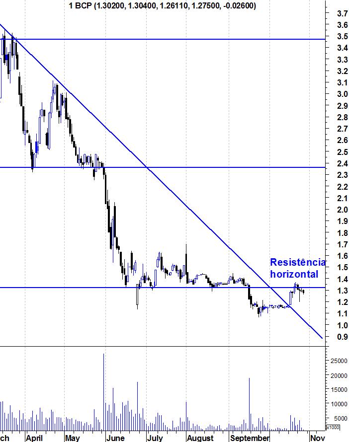 A cotação do BCP, realmente, lá bateu na tal resistência, antes, em torno de 0,0180 euro, hoje, em torno de 1,35 euro, e recuou, como era expectável.