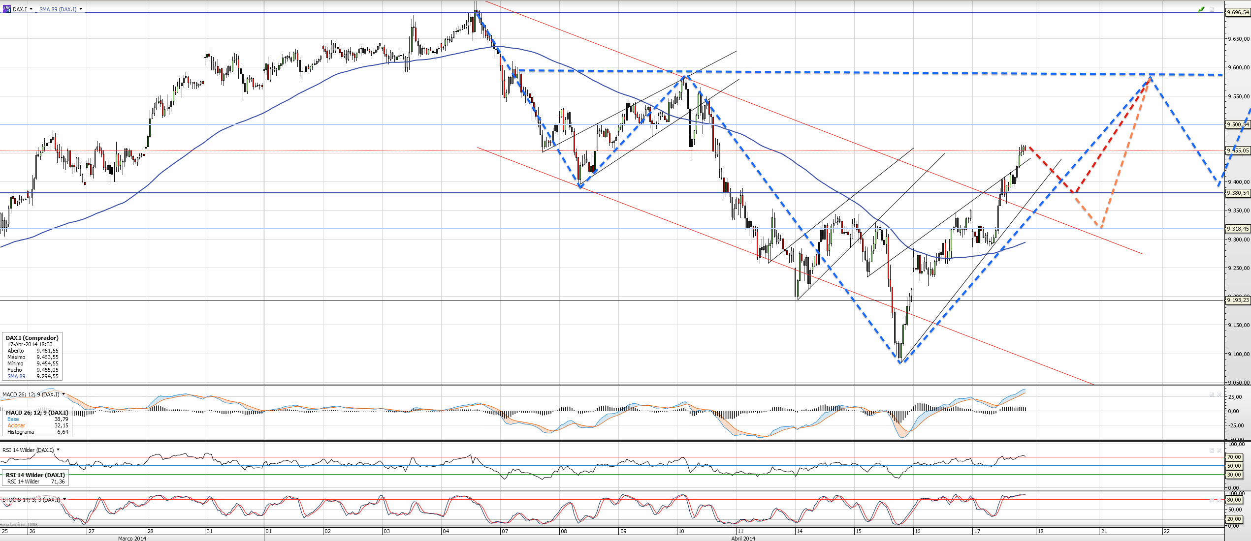 Continuo longo, e colocarei stop profit depois de ultrapassar os 9380 (meu target inicial) e andar por cima dos 9430. A MA a azul traçada costuma dar-me indicação da tendência dominante, e hoje acabou por ficar flat, será que vamos inverter? Em Março tivemos esse comportamento. Daí projectar ainda uma visita aos 9280 antes de subir mais alto se for esse o caminho a tomar.