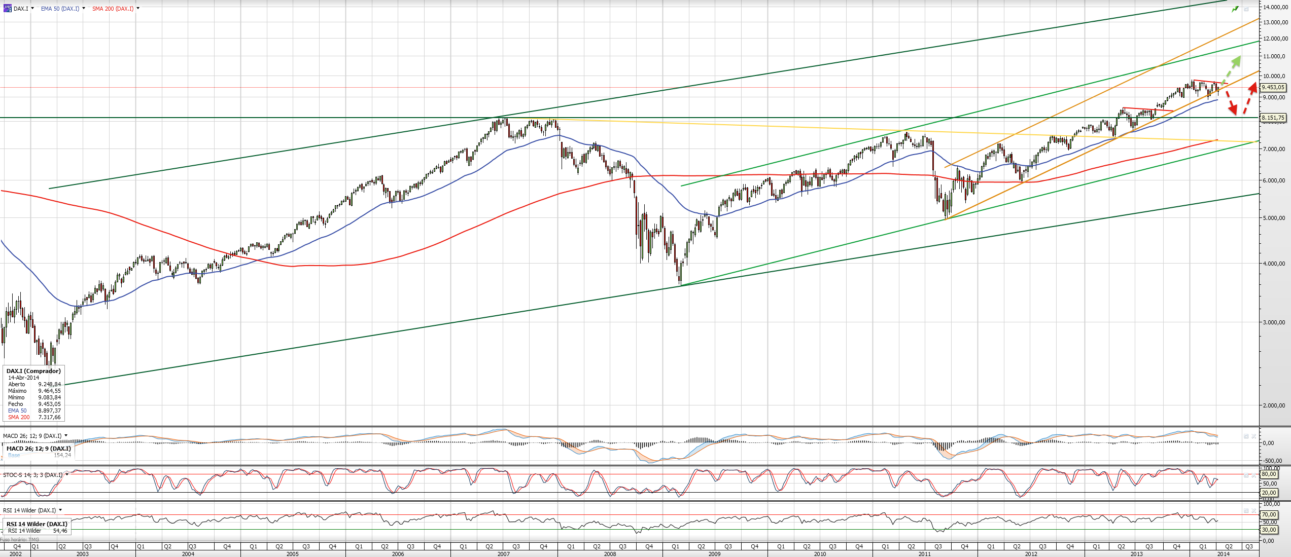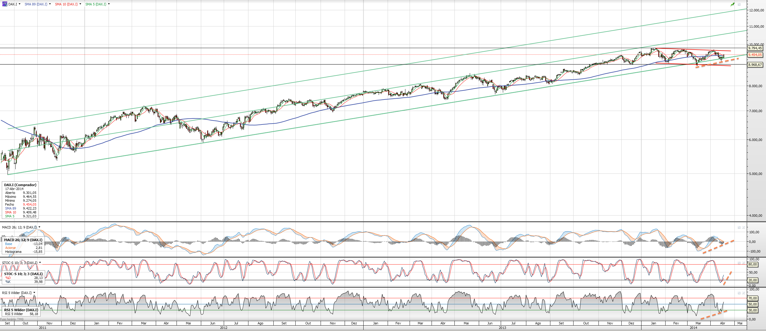 Sinto-me desconfortável em colocar uma nova posição no DAX, julgo que pode existir uma tentativa à quebra do canal, vamos ver. Se não o fizer e continuar a descer, a confiança para uma nova migração a valores mais baixos será mais alta, mais especuladores irão entrar na onda, e a tendência será mais pronunciada.
