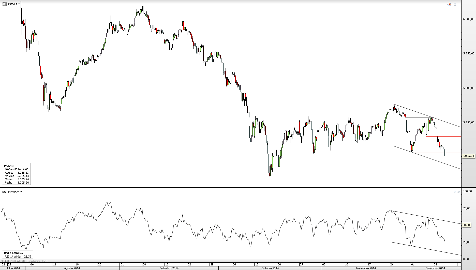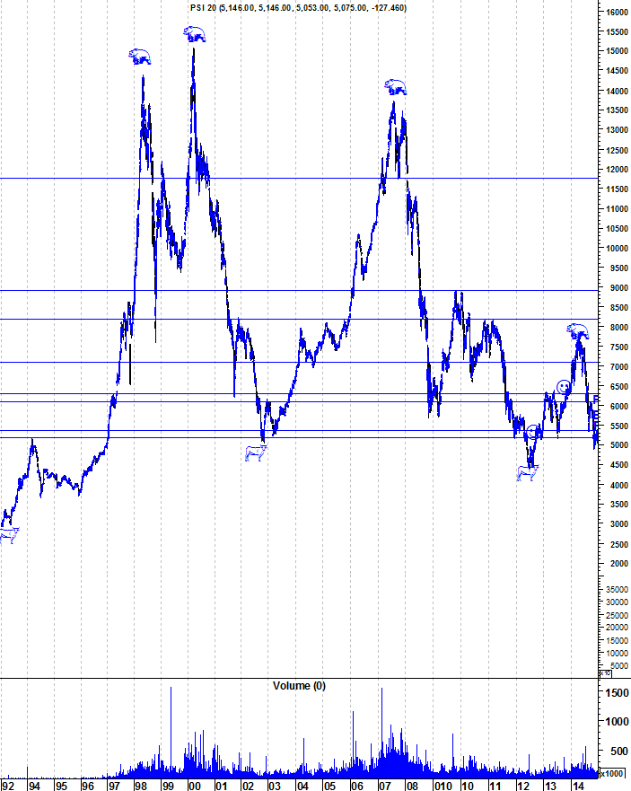 Poderia colocar essa linha nos 5100, por exemplo. O importante é essa zona de resistência até aos 5350 que corresponde ao mínimo relativo do PSI em Agosto deste ano. Os tais 5200 também serviram de suporte ao índice por duas vezes em 2012 e uma vez em 2013.