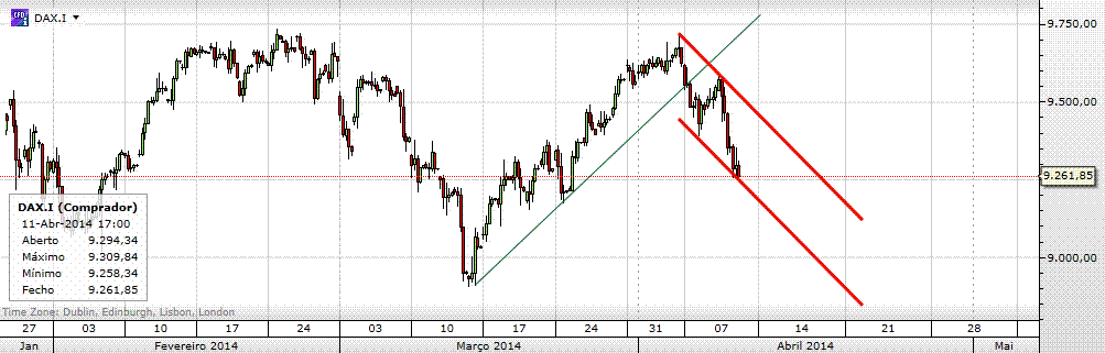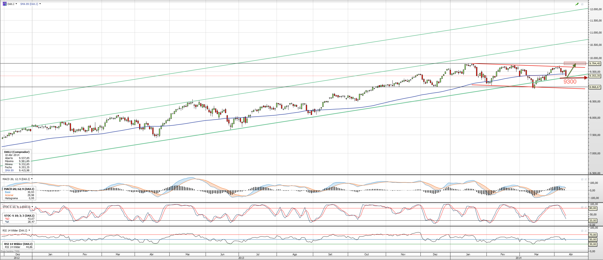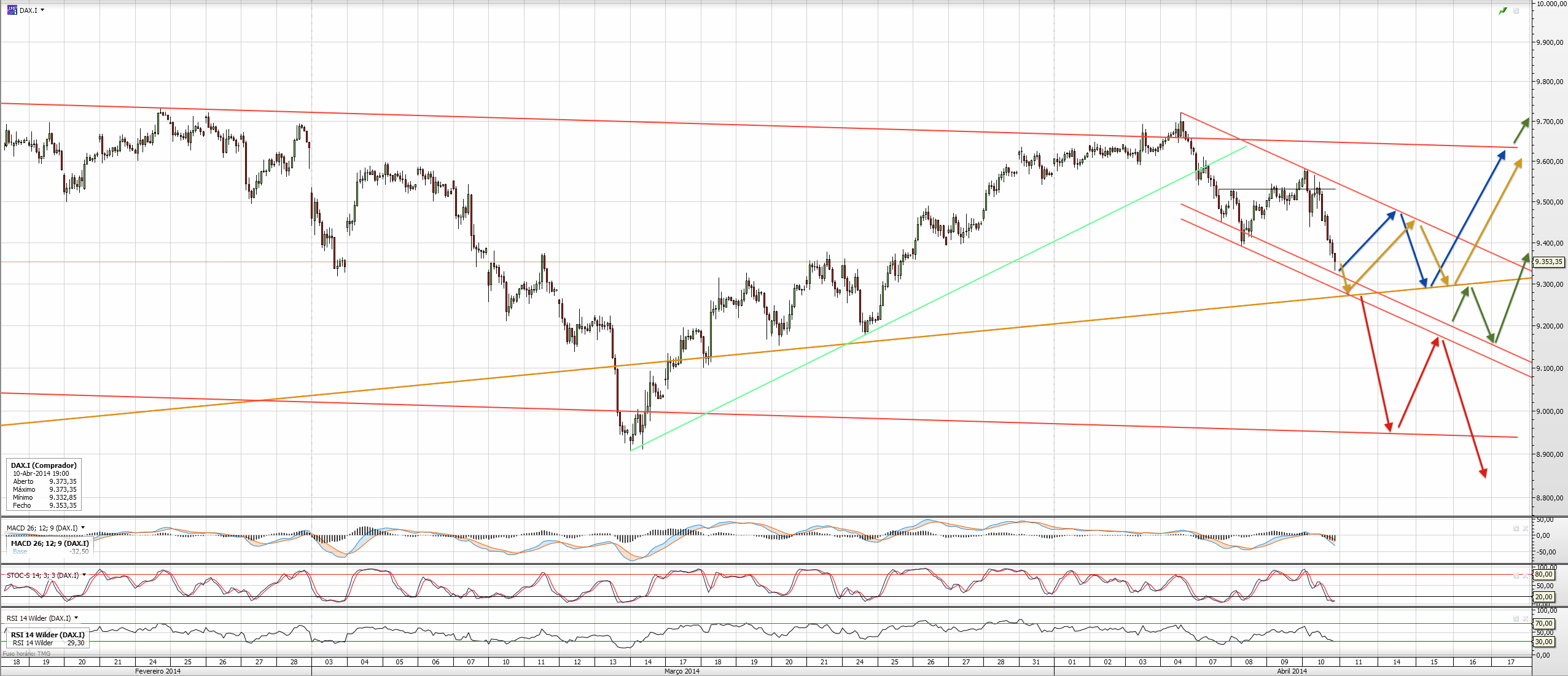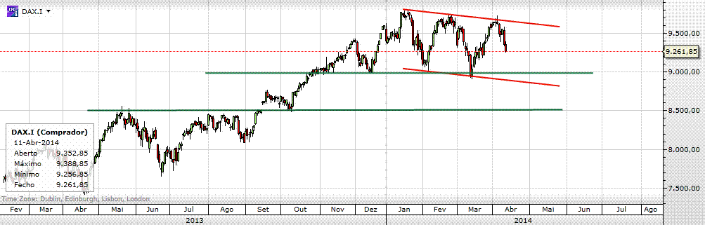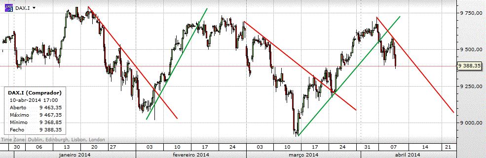 No gráfico diário o dax está a negociar dentro de um "canal" quase horizontal e está numa "perna" descendente. O proximo alvo serão os 8900, que coincidem (+1% -1%) com um suporte forte nessa zona (9000) que já suportou o indice várias vezes. Se quebrar este suporte, o próximo serão os 8500.