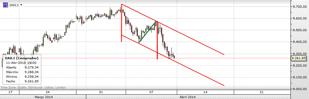 Ainda tenho o meu longo aberto. E espero fechá-lo no topo do canal descendente formado nesta última semana. Depois logo vejo como reaje. Não tenho a plataforma aberta comigo, e não consigo vislumbrar o padrão que se formou entretanto. Se calhar, estou a cometer uma asneira, logo à noite vejo! Até lá ainda bem que fechei os olhos a esta descida abaixo dos 9300