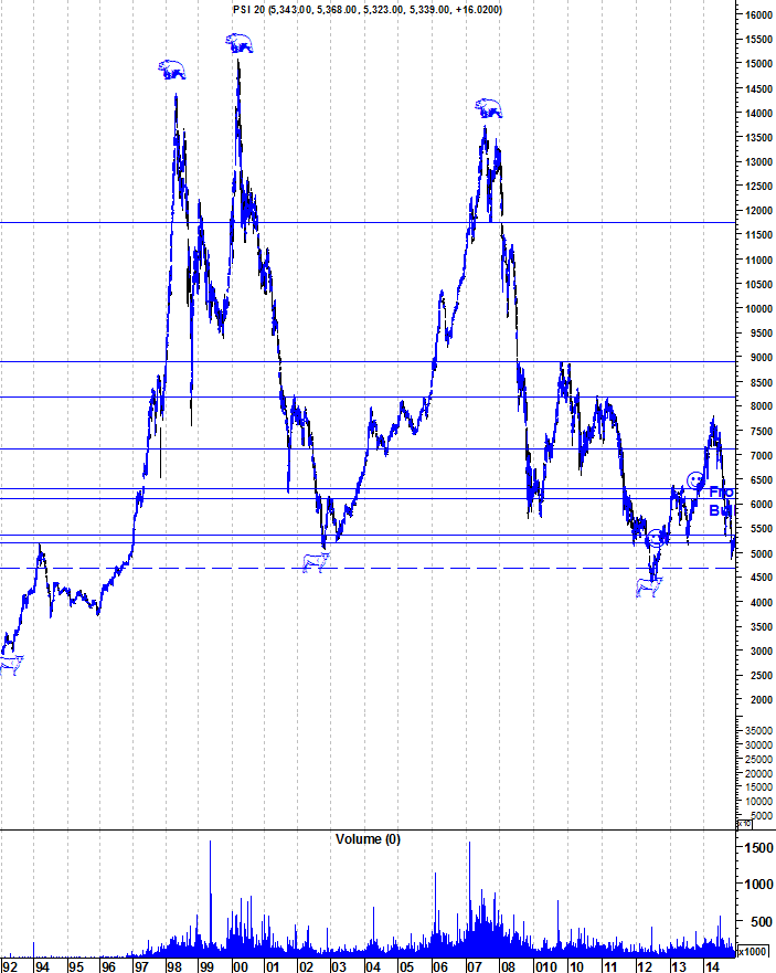 Deixo os gráficos actualizados do PSI, numa altura em que o índice nacionar anda a "flirtar" com a resistência na zona dos 5350 pontos, sendo que a mais dura das resistências se encontra entre os 6100 e os 6300 pontos.