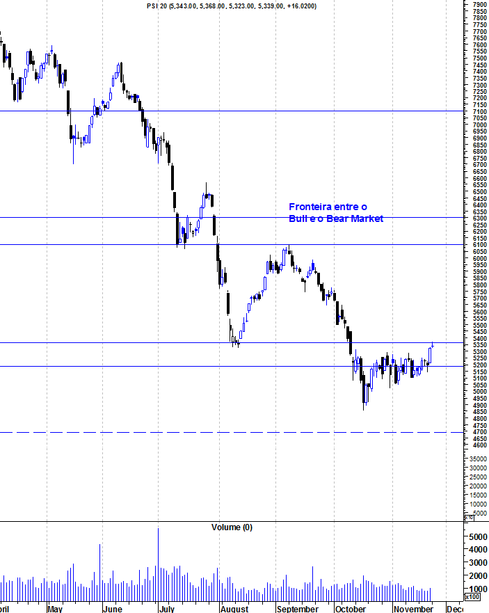 Acredito que a zona entre os 5350/5400 poderá exercer alguma pressão vendedora, conforme assinalei no gráfico. Caso ultrapasse essa zona sem dificuldade, é porque os bulls estão a começar de aparecer.