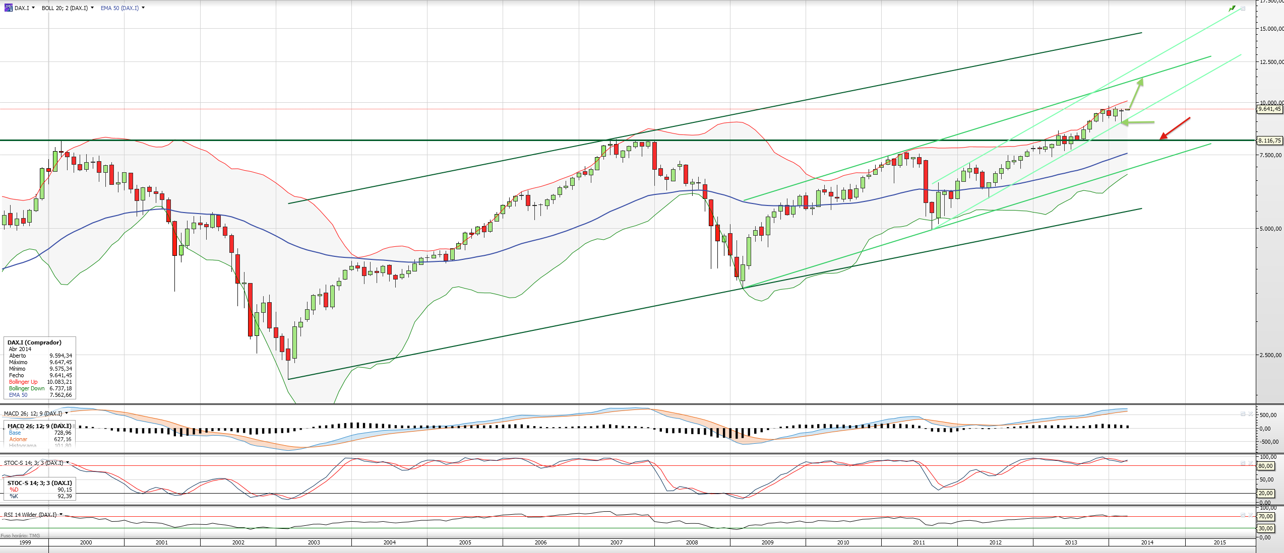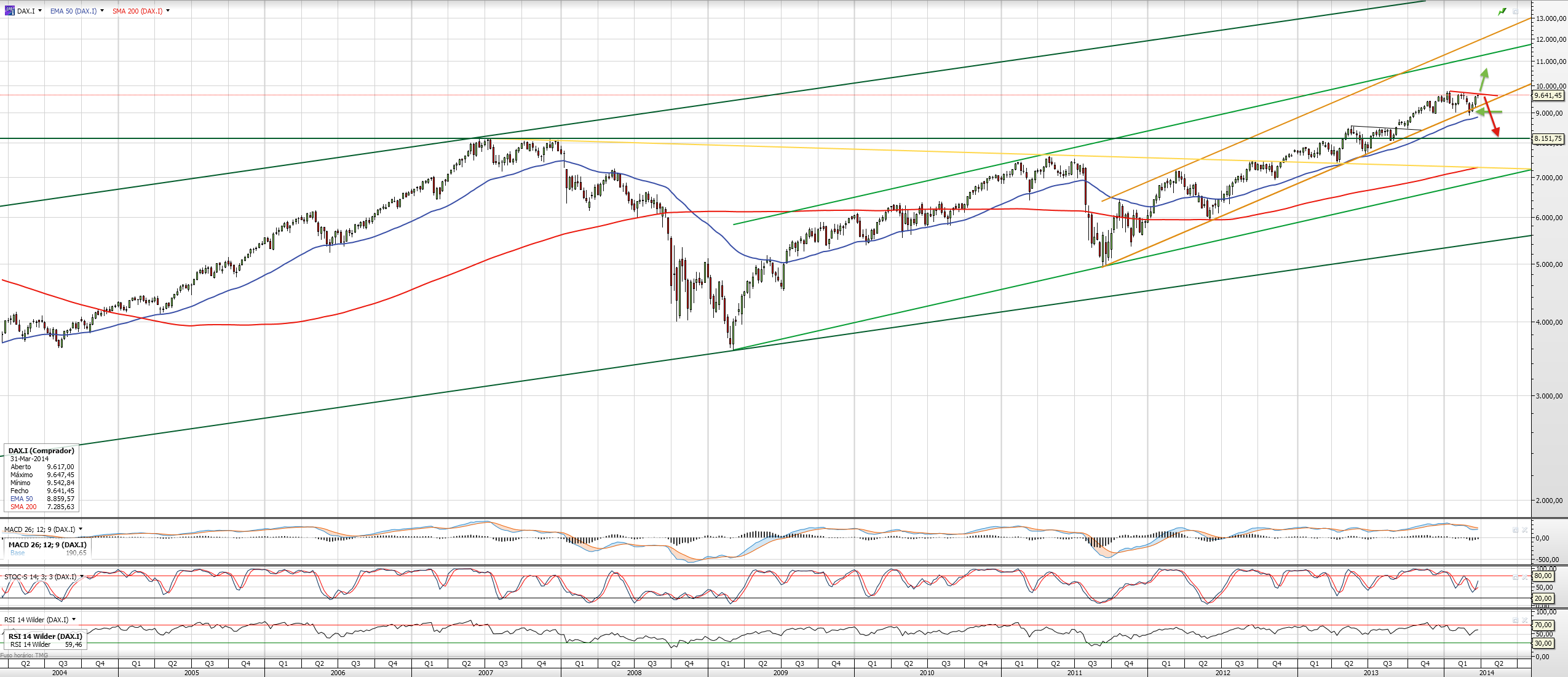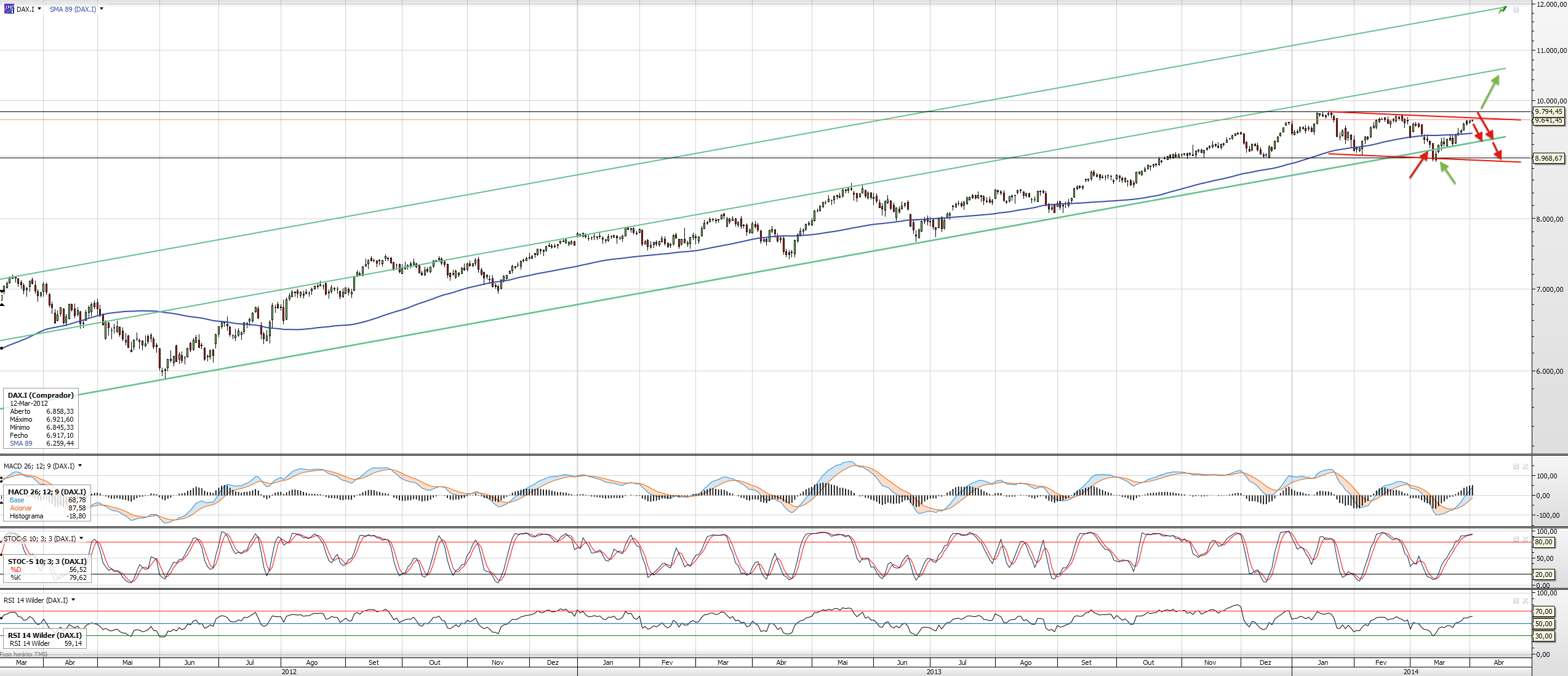 - A linha vermelha pode ser quebrada, mas não fica longe a resistência horizontal, e poderá ser aí a perda de gás??? O SPX parece querer subir mais e o DAX pode acompanhar até aqui?