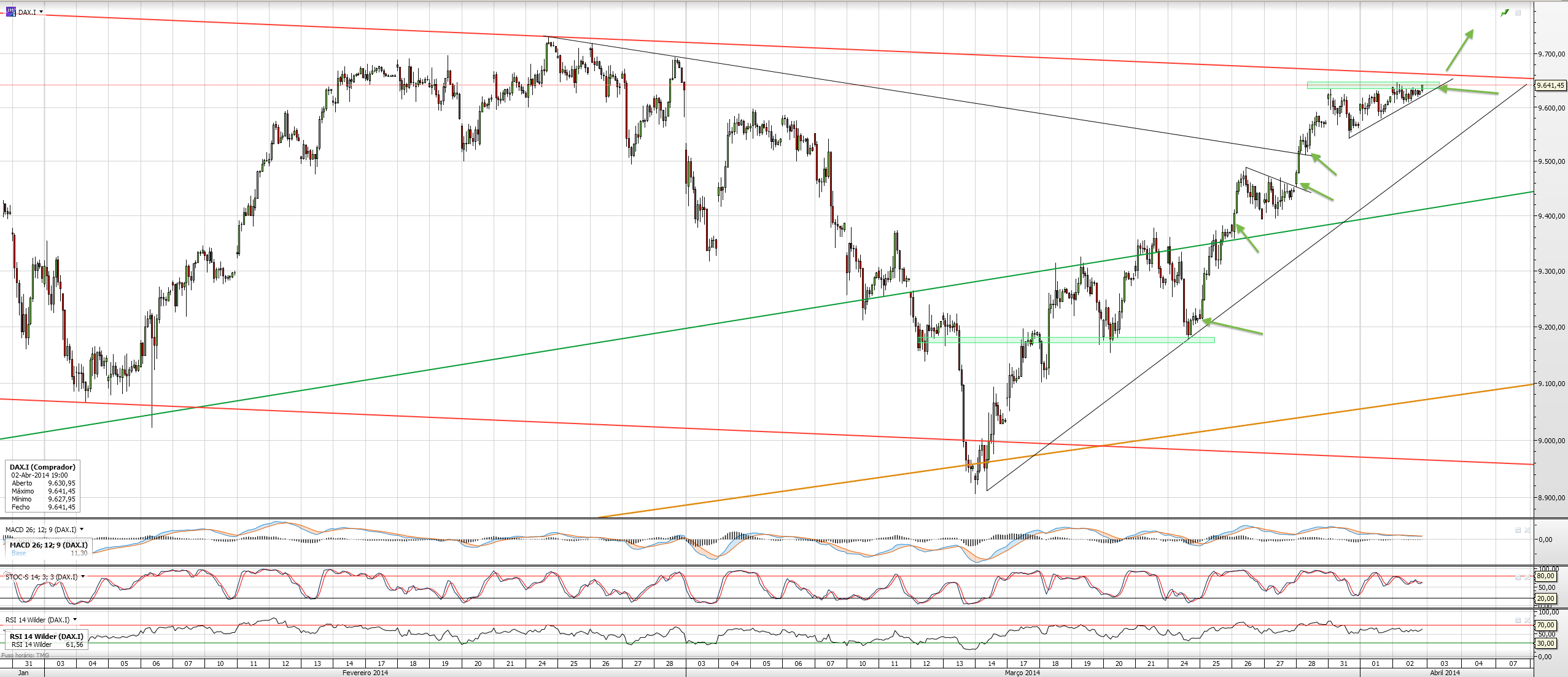 Entrei curto nos 9610 ontem e vou fechar amanhã se ultrapassar a linha vermelha do TF1h. A única farpa para picar o DAX para baixo na minha opinião é mesmo a linha vermelha como resistência.